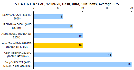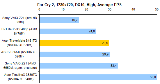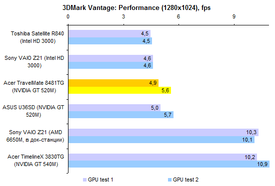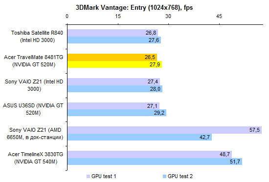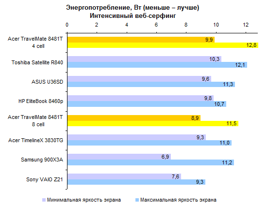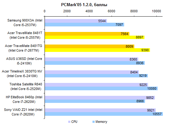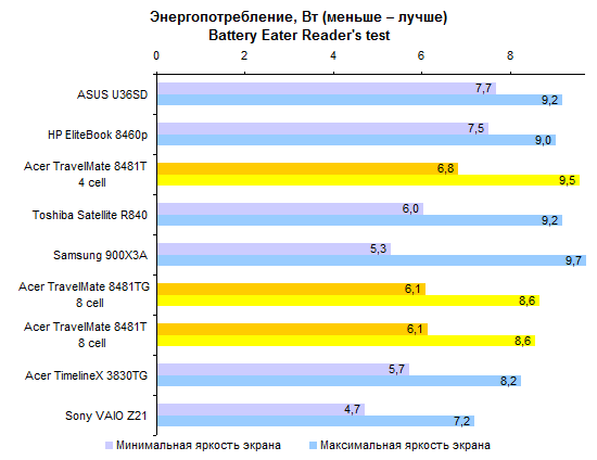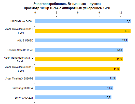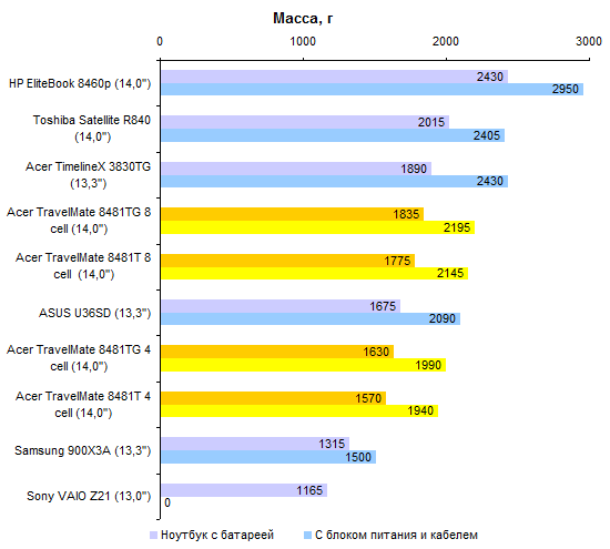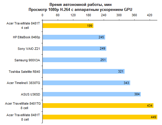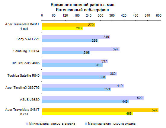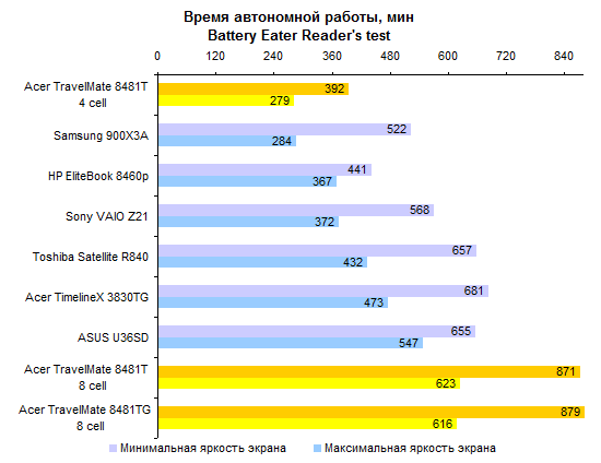 По производительности процессора ULV-модели все-таки отстают от «полноразмерных». Но отставание это не так уж велико — к решению большинства офисно-домашних задач Core i5-2557M и Core i7-2677M вполне готовы. За старшую из этих двух моделей ЦП переплачивать едва ли есть смысл, разница между ними не особенно велика.  Интегрированное графическое ядро в ULV-процессорах Intel работает на несколько менее высоких частотах, чем в полноразмерных мобильных процессорах. И это следует иметь в виду при покупке ноутбука: если есть желание играть — а эта осень весьма богата на новые игры, в которые можно захотеть играть, даже если вы делаете это не так уж часто — то имеет смысл обратить внимание на TravelMate 8481TG, оборудованный двойной графикой.      Установленный в нем GeForce GT 520M звезд с неба не хватает, но он все-таки немного быстрее, чем интегрированная графика Intel. А в новых играх это «немного» может стать как раз той самой разницей между «более-менее играбельно» и «неиграбельно вовсе». ⇡#Тестирование — масса, время автономной работыНоутбук можно приобрести с аккумулятором двух типов. Во-первых, это может быть тонкая 4-элементная батарея, емкость которой составляет 44,4 Вт*ч. Это ровно столько же, как в Sony VAIO Z21, чуть больше, чем в HP ProBook 5320m и чуть меньше, чем в Apple MacBook Air 13 или Samsung 900X3A. Плюс этого аккумулятора состоит в том, что он полностью умещается в своем отсеке. Второй вариант — 8-элементная батарея. Ее емкость ровно вдвое больше — 88,8 Вт*ч. И на данный момент это рекордный показатель емкости комплектного аккумулятора для компактных ноутбуков. Большего можно добиться только от дополнительной батареи, подключаемой на днище, — например такой, как в обзоре HP EliteBook 8460p. Однако есть и минус: в отсеке помещается только половина аккумулятора. В отличие от ASUS U36SD, где батарея выступает из корпуса минимально, здесь она все-таки изрядно выпирает. Пожалуй, компоновку ноутбука ASUS в этом смысле следует признать более удачной. Обе конфигурации, как 8481T, так и 8481TG, комплектуются блоком питания мощностью 65 Вт, более компактным, чем обычные адаптеры этого типа. Для полного счастья данному блоку питания не хватает разве что возможности подключения напрямую к розетке через съемный штекер — как в макбуках или в Samsung 900X3A. Что касается массы, то ее оценка сильно зависит от того, с ноутбуками какой категории сравнивать. Если говорить о 14-дюймовых моделях, то Acer TravelMate 8481T — один из самых легких ноутбуков этой категории, если не самый легкий вообще. По сравнению с 14-дюймовой классикой, к примеру, с EliteBook 8460p, он легче на 600-1000 граммов в зависимости от того, что именно учитывать. При сравнении массы TravelMate 8481T и полноразмерных «тринашек», ярким примером которых является TimelineX 3830TG от той же Acer, наблюдается паритет. Ну а если принимать в расчет наиболее тонкие и легкие, «воздушные» 13-дюймовые модели, то TravelMate 8481 окажется все же существенно тяжелее — особенно с 8-элементным аккумулятором. Так или иначе, ноутбук достаточно легкий, чтобы считать его отличным мобильным вариантом. Автор этого обзора опробовал TravelMate 8481 в поездке и был всецело удовлетворен массогабаритными характеристиками.  Не говоря уже о том, что этот ноутбук оказался чрезвычайно долгоиграющим. Он побил рекорд модели ASUS U30SD и стал новым чемпионом нашей тестовой лаборатории по времени автономной работы. В режиме работы с минимальной нагрузкой 