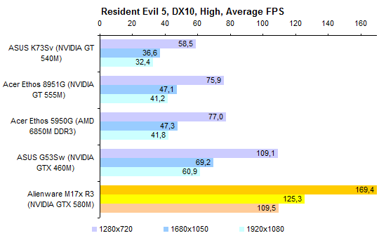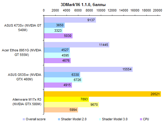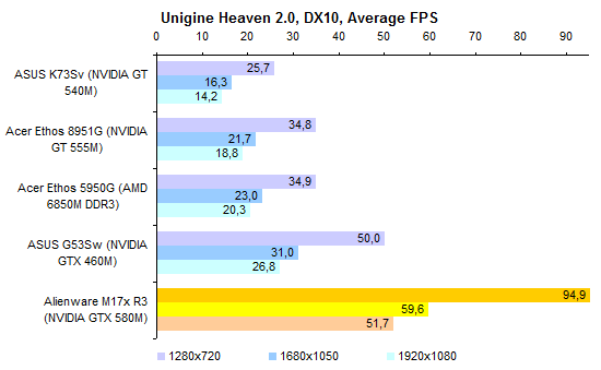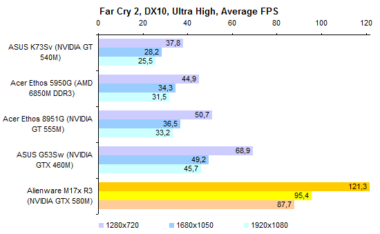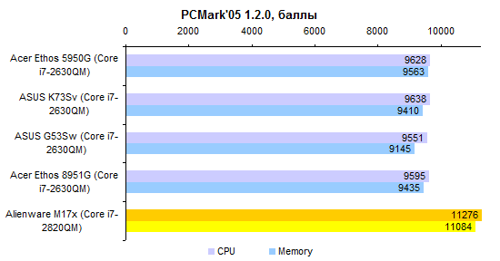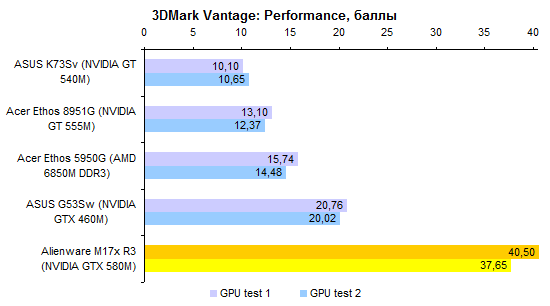 В протестированном ноутбуке был установлен неизведанный нами доселе процессор Core i7-2820QM. Это четырехъядерная модель, номинальная тактовая частота которой составляет 2,3 ГГц. В режиме Turbo Boost частота может подниматься до 3,4 ГГц. ![]() Этот ЦП обладает поддержкой всех актуальных технологий Intel, включая набор инструкций AES NI. Объем кеш-памяти третьего уровня в нем увеличен до 8 Мбайт. Объем памяти в нашем случае составлял относительно скромные для «замены настольного компьютера» 8 Гбайт. Несмотря на то, что процессор Core i7-2820QM умеет работать с памятью DDR3-1600, в протестированном экземпляре использовалась стандартная DDR3-1333. ![]() Впрочем, самое главное в этом ноутбуке — графическая система. И она чрезвычайно хороша. Во-первых, Alienware M17x поддерживает технологию динамического переключения между внешним и интегрированным графическими адаптерами, NVIDIA Optimus. Поэтому в тех случаях, когда мощный видеоадаптер не используется, он не потребляет энергии и не генерирует тепла, позволяя ноутбуку оставаться холодным и тихим. Во-вторых, сам по себе графический адаптер тоже достоин уважения. Это топовое мобильное решение NVIDIA, GeForce GTX 580M. Чип состоит из 384 потоковых процессоров и 64 текстурных модулей. Это ровно вдвое больше, чем у более популярного в геймерских ноутбуках GTX 560M. И в четыре раза больше, чем у мейнстрим-решения GeForce GT 540M. Такому мощному чипу и память требуется соответствующая: GTX 580M комплектуется 2 Гбайт быстрой GDDR5 (4x750 МГц) с 256-битной шиной. Пропускная способность, таким образом, составляет 96 Гбайт/с. По этому показателю GTX 580M примерно в полтора раза превосходит GTX 560M и почти вчетверо — GT 540M. В общем, по меркам мобильной графики это настоящий монстр. Все значимые компоненты системы размещены под единым «капотом» на днище ноутбука. Доступ к ним максимально удобен. Здесь можно обнаружить оба отсека для жестких дисков, процессор, графический адаптер, выполненный в виде платы MXM (то есть при большом желании — заменяемый), и два разъема расширения оперативной памяти. Судя по спецификациям на сайте производителя, слотов для оперативки должно быть четыре. Видимо, еще два расположены на обратной стороне материнской платы — до них добраться будет заметно сложнее. Мы, во всяком случае, целиком разбирать ноутбук не стали и их не обнаружили. Поскольку и процессор, и видеоадаптер — весьма мощные и не слишком холодные, система охлаждения двойная. Что приятно, вентиляторы очень удобно снимаются, поэтому вынуть их и как следует прочистить при необходимости будет несложно. ⇡#Тестирование — производительность