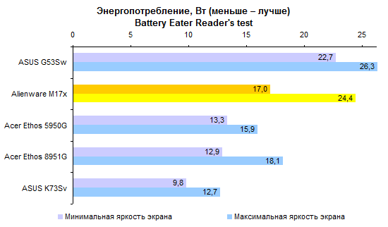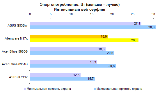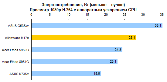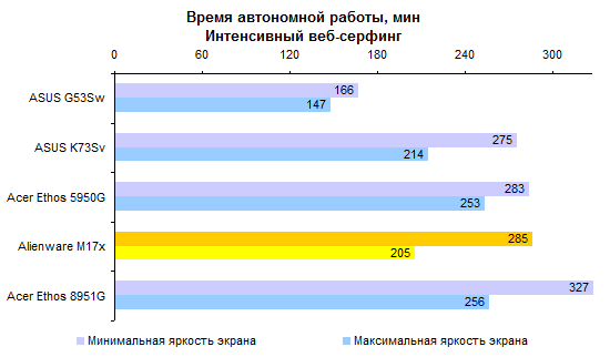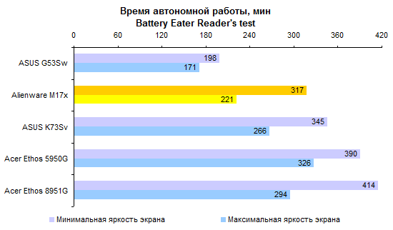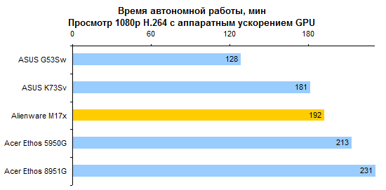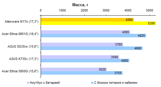 Процессор Core i7-2820QM совершенно предсказуемо опережает Core i7-2630QM с хорошим отрывом. Стоит ли такая прибавка производительности тех денег, которые за нее попросят, — вопрос, не имеющий однозначного ответа. Предлагаем каждому читателю ответить на него самостоятельно. ![]() Что касается результатов тестирования производительности, то это чистая поэзия. Какие-либо комментарии совершенно излишни — просто смотрите на графики и наслаждайтесь: ![]() ![]() ![]() ![]() ![]() ![]() Помимо измерения уровня кадров в секунду в нашем стандартном наборе тестовых приложений, удалось также как следует опробовать Alienware M17x в настоящем деле — в играх Crysis 2 и Witcher 2. Естественно, в родном разрешении дисплея — 1920х1080. Первая из этих двух игр прекраснейшим образом работает на максимальных настройках. А вот неистовым польским парням из CD Projekt таки удалось как следует нагрузить GeForce GTX 580M — на максимальных настройках картинка заметно подтормаживала, так что пришлось снизить качество на одну ступень. Поэтому предостерегаем вас от завышенных ожиданий. GeForce GTX 580M — это, пожалуй, самый быстрый мобильный видеоадаптер, но все же по производительности он уступает топовым настольным решениям. ⇡#Тестирование — масса, время автономной работыНоутбук комплектуется большой, тяжелой и весьма емкой батареей, состоящей из 9 элементов питания. Элементы использованы достаточно продвинутые, так что суммарная емкость получилась весьма внушительной: 90 Вт*ч. Поскольку экономить на приятных мелочах в случае априори дорогого ноутбука бессмысленно, конструкторы оборудовали аккумулятор встроенным световым индикатором заряда. Работает он обычным способом: нажимаете на узкую кнопку, и диоды высвечивают оставшуюся долю запаса энергии. В данном случае — 100%. Штатный адаптер обладает мощностью, которой могут позавидовать и иные десктопные блоки питания, — 240 Вт. Интересно, что вместо обычного для ноутбуков силового кабеля IEC C5 (с сечением разъема в виде трилистника) здесь использован привычный компьютерщикам IEC C13. Обычно мощные и крупные блоки питания для геймерских ноутбуков делают примерно с теми же пропорциями, что и обычные адаптеры на 65 или 90 Вт. То есть относительно узкими и высокими. Из-за этого носить их вместе с ноутбуком крайне неудобно — блок питания раздувает сумку и торчит неприличным горбом. В данном случае конструкторы подумали об этом обстоятельстве и сделали адаптер более широким и плоским. Получилось значительно удобнее для транспортировки. К сожалению, масса Alienware M17x примерно в полтора раза превышает предел взвешивания наших тестовых весов. Поэтому проверить заявленную производителем характеристику в данном случае не получилось — на графике приведена именно она. Ноутбук, конечно, совсем не легкий. Однако его все-таки не так уж тяжело носить, если подобрать правильную сумку. ![]() В случае крупного и мощного ноутбука аккумулятор стоит рассматривать в основном как замену громоздкого источника бесперебойного питания. Всерьез думать о мобильном использовании портативного компьютера такого типа едва ли кто-то станет. Тем не менее, последнее поколение процессов Intel и технология NVIDIA Optimus серьезно увеличили время автономной работы даже для таких устройств. Скажем, в режиме минимальной нагрузки на систему Alienware M17x может продержаться до пяти часов — сравнимый по производительн