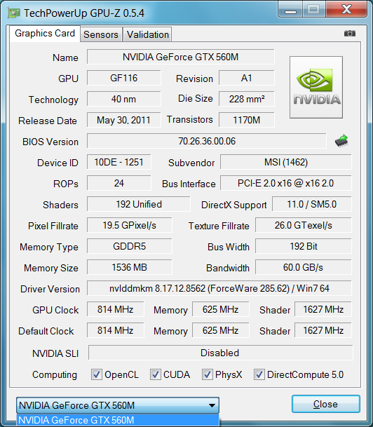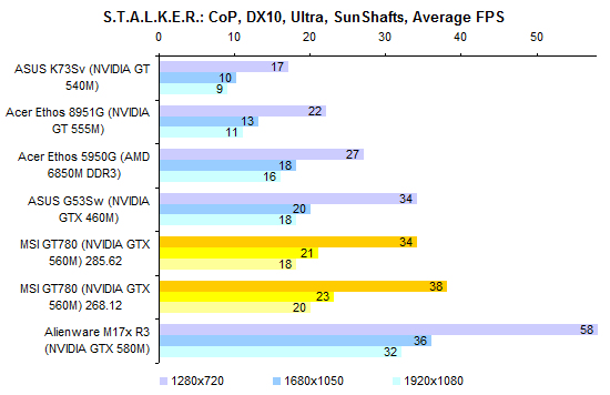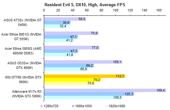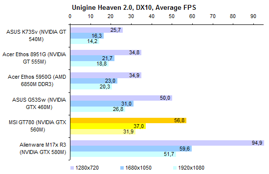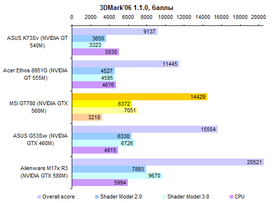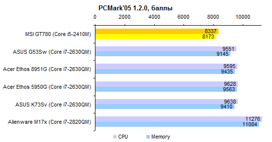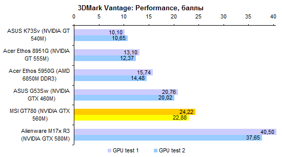 Подавляющее большинство производителей старается оснастить игровые и даже «игровые» ноутбуки мощными четырехъядерными процессорами. А вот в российском представительстве MSI по-прежнему практикуют довольно необычный подход: в ноутбуки геймерской серии ради экономии (и, надо заметить, достаточно оправданной экономии) устанавливают недорогие двухъядерные процессоры. В данном случае это Core i5-2410M, младшая модель семейства Core i5. Стоит отметить, что есть модификации GT780 и с четырехъядерными Core i7. ![]() Номинальная частота этого ЦП составляет 2,3 ГГц. Но, в отличие от более дешевых Core i3, он все-таки поддерживает Turbo Boost и может динамически разгоняться до 2,6 ГГц, если нагрузка ложится на оба вычислительных ядра, и даже до 2,9 ГГц, если нагружается только одно из них. Объем предустановленной оперативной памяти невелик — 4 Гбайт. Впрочем, если этого покажется мало, его без проблем можно удвоить, утроить или даже учетверить, ведь остаются свободными еще три разъема раширения. В MSI GT780 отсутствует поддержка NVIDIA Optimus, технологии автоматического переключения графики. Поэтому во всех без исключения режимах задействована внешняя графика — NVIDIA GeForce GTX 560M. Этот ускоритель основан на чипе GF116: 192 потоковых процессора, 32 текстурных модуля и 192-битная шина памяти. Мощный чип дополняют 1,5 Гбайт видеопамяти стандарта GDDR5 (4х525 МГц). ![]() Большая часть компонентов размещена на нижней стороне материнской платы, а огромный люк на днище ноутбука позволяет получить к ним быстрый и удобный доступ. В этом отсеке можно обнаружить процессор, графический адаптер в виде отдельной платы MXM (то есть теоретически заменяемый), два посадочных места для жестких дисков и два разъема расширения памяти из четырех, доступных в MSI GT780. Еще два разъема SO-DIMM скрываются под клавиатурой, там же находятся и платы Mini Card. Дизайн корпуса, судя по внешним признакам, предусматривает возможность использования системы охлаждения с двумя полностью независимыми кулерами. Вероятно, это своего рода «задел» под экстремально мощные конфигурации. Впрочем, может быть и так, что от двойной СО решили отказаться в пользу отсека для второго жесткого диска на позднем этапе разработки и в целях экономии времени обошлись быстрой перекомпоновкой. Так или иначе, в MSI GT780 только один вентилятор, обдувающий одновременно два радиатора. ⇡#Тестирование — производительность