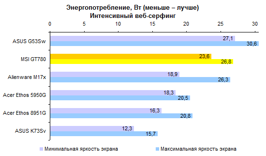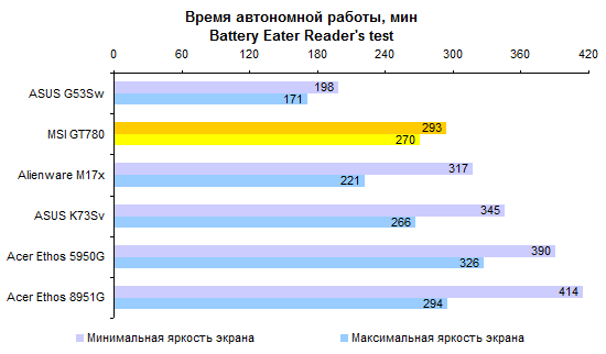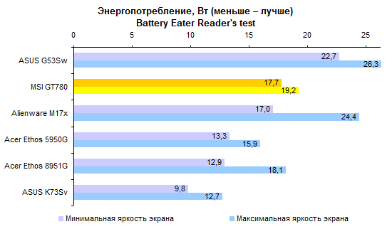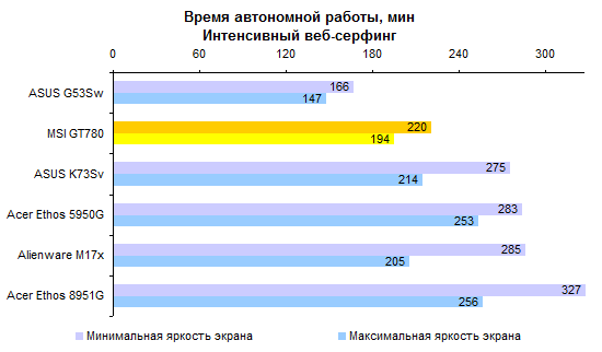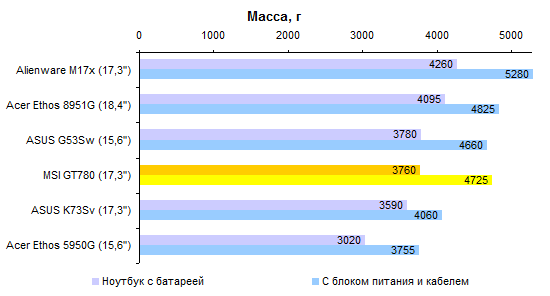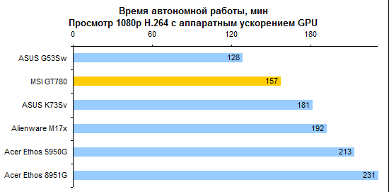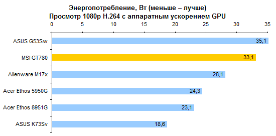 В тестах процессора этот ноутбук не хватает звезд с неба. Иного не стоило ожидать, все-таки процессор здесь далеко не самый быстрый. Скажем прямо, MSI GT780 — не та модель, которую стоит покупать, если есть потребность в высокой вычислительной мощности центрального процессора. ![]() Зато в тестах графики результаты более чем приличные. Ноутбук Alienware с GeForce GTX 580M показывает ощутимо большую производительность, но он и стоит примерно втрое дороже. А сравнимых по цене конкурентов, Acer Ethos, ноутбук MSI обходит играючи. ![]() ![]() По номеру модели GeForce GT 555M и GTX 560M различаются всего на «пять копеек». Однако если говорить о реальной производительности, то между этими решениями лежит целая пропасть. Имейте это в виду при покупке. ![]() ![]() ![]() ![]() Следует также иметь учесть, что любой ноутбук с GeForce GTX 580M обойдется на российском рынке в совершенно безумные деньги. Так что результаты этого адаптера приведены только для лучшего понимания уровня GTX 560M — в реальной жизни эти графические решения друг с другом не конкурируют. ⇡#Тестирование — масса, время автономной работыКак и большинство ноутбуков класса «замена настольного компьютера» MSI GT780 комплектуется крупным, серьезным аккумулятором: 9 элементов питания, суммарная емкость около 87 Вт*ч. Мощность комплектного блока питания составляет всего лишь 150 Вт. И после 240-ваттного адаптера Alienware M17x воспринимается он компактным и легким. Блок питания совершенно лишен маркировки — наклейки с характеристиками и прочей информацией нет ни снизу, ни сверху. Несмотря на высокую производительность в графике и ряд наворотов в экстерьере, весит MSI GT780 весьма умеренно. Примерно на уровне обычной «семнашки» или сравнимой по скорости геймерской «пятнашки». ![]() Графика в этой модели использована весьма мощная и прожорливая, а возможности переключения на интегрированный адаптер не предусмотрено. Поэтому MSI GT780 обладает не таким уж большим запасом хода, несмотря на высокую емкость аккумулятора. ![]() ![]() ![]() ![]() ![]() ![]() Впрочем, это справедливо, только если сравнивать с современными ноутбуками, образца 2011 года. В прошлом году о таком времени автономной работы игровых моделей не приходилось и мечтать. Даже вдвое меньшие результаты были неплохим достижением. ⇡#ВыводыПерфекционистам, не способным закрыть глаза на некоторые недостатки MSI GT780, советуем почитать обзор Alienware M17x R3. И особое внимание уделить строчке «ориентировочная цена» в таблице технических характеристик. Полагаем, этого будет вполне достаточно, чтобы спуститься с небес на землю и по достоинству оценить старания MSI в деле создания доступных альтернатив для геймеров. Да, внешний вид MSI GT780 несколько вторичен, качество материалов и продуманность конструкции не вполне идеальны, а клавиатура светится не так задорно. Но все-таки она светится и выглядит ноутбук в целом неплохо. Самое главное: MSI GT780 обеспечивает действительно высокую скорость в играх за относительно небольшие деньги. А в качестве бонуса — хороший дисплей с матовым покрытием. Матовым! А не c «суперглянцем», дико бликующим при наличии любого источника освещения. Кстати, у MSI есть еще более быстрая модификация этой модели, GT780DX. Она немного дороже, зато в ней использованы процессор Core i5-2430M и графический адаптер GeForce GTX 570M. Тоже интересный вариант. ![]()