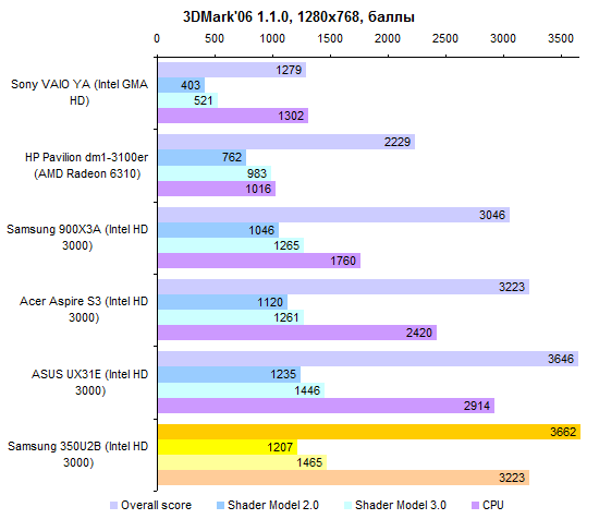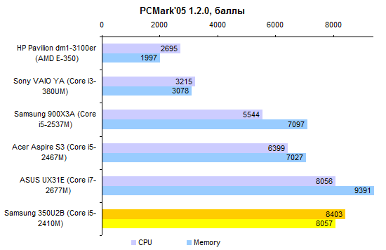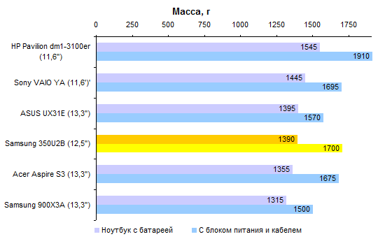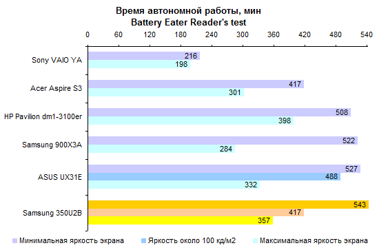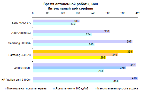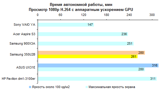Samsung 350U2B — единственный участник теста, оборудованный полноценным мобильным процессором, поэтому он существенно превосходит большинство соперников по производительности ЦП. Составить ему достойную конкуренцию смог только ASUS UX31E, оснащенный самым старшим и самым дорогим ULV-процессором Intel. ![]() Все сравниваемые ноутбуки оснащены встроенными в процессор графическими адаптерами и обладают, по большому счету, сравнимой производительностью в 3D-приложениях. За исключением модели Sony VAIO YA, в которой используется платформа Intel предыдущего поколения — прошлогодняя графика Intel существенно уступает нынешней. ![]() Этот ноутбук не создан для игр, однако для всех других видов цифровых развлечений и работы его производительности будет вполне достаточно. В этом плане Samsung 350U2B на порядок лучше нетбуков. ⇡#Тестирование — масса, время автономной работыАккумулятор в данной модели несъемный, построенный на плоских элементах питания. По площади он занимает менее половины корпуса. Поскольку ноутбук не экстремально тонкий, батарея тоже довольно-таки упитанная. Благодаря этому конструкторам удалось добиться весьма приличной емкости — около 47 Вт*ч. Ноутбук комплектуется крайне компактным адаптером мощностью 40 Вт. А вот масса блока питания не так уж мала: он весит около 200 грамм, еще сотню добавляет силовой кабель. Пластиковый корпус при равной прочности весит больше, чем металлический. Поэтому Samsung 350U2B получился не таким уж легким: этот 12,5-дюймовый ноутбук весит больше, чем 13,3-дюймовые ультрабуки. Но если сравнивать с недорогими ноутбуками даже меньшей диагонали, то 350U2B оказывается достаточно легким. ![]() Время автономной работы вполне приличное. В режиме минимальной нагрузки можно рассчитывать на 6-9 часов свободы от проводов. ![]() Работа с веб-страницами существенно ухудшает результаты: если в предыдущем тестовом сценарии Samsung 350U2B оказался лучшим, то в беспроводном веб-серфинге он уступает двум конкурентам. ![]() Примерно та же картина и при воспроизведении Full HD-видео. Заряда хватает на 4 часа 20 минут при максимальном уровне подсветки дисплея. Если притушить экран до 100 с небольшим кд/м2, то удастся увеличить время работы еще на 20 минут. ![]() ⇡#ВыводыВ отличие от ультрабуков, Samsung 350U2B выглядит неприметно. Однако реальных достоинств у него, пожалуй, даже больше. В компактном корпусе этой модели конструкторы Samsung умудрились совместить взрослую производительность, приличный запас автономности и на удивление высокое удобство работы, которое обеспечивают полноразмерная клавиатура и дисплей с матовым покрытием. Пожалуй, в приобретении Samsung 350U2B было бы немало смысла даже при более высокой цене, ну а за те 19 тысяч рублей, с которых стартует данная модель в российской рознице, — это однозначно лучшая покупка. Редакция 3DNews благодарит компанию «Графитек» и лично Василия Дождалёва за предоставленный в распоряжение нашей лаборатории измерительный комплекс Spyder3Studio. ![]()