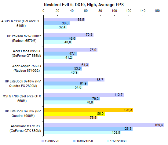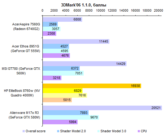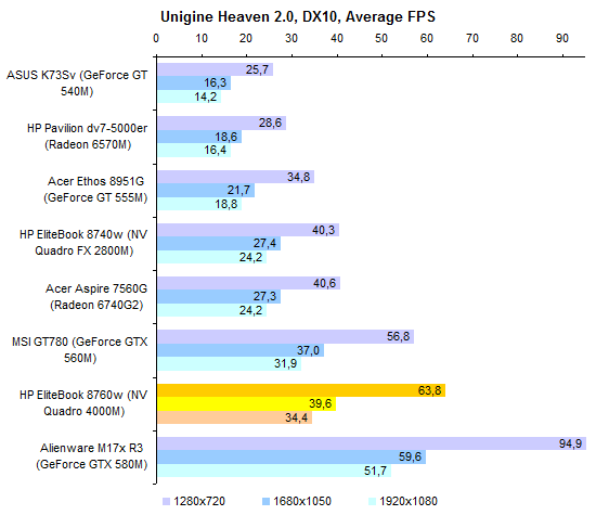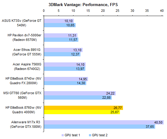 Пониженные частоты, на которых работает NVIDIA Quadro 4000M, дают о себе знать: несмотря на то, что по количеству блоков графический процессор ближе к GeForce GTX 580M, чем к GTX 560M, по производительности Quadro 4000M больше похож именно на последний.