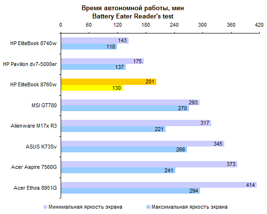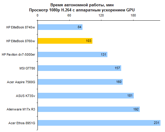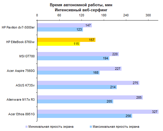 Из-за отсутствия поддержки NVIDIA Optimus — или любого другого варианта переключения с внешнего графического адаптера на интегрированный — автономность ноутбука очень сильно пострадала. Максимум, на что можно рассчитывать при работе с HP EliteBook 8760w — 200 минут работы от аккумулятора. Весьма серьезно влияет на время автономной работы яркость дисплея. При максимальном уровне подсветки экран потребляет на 10 с лишним ватт больше, чем при минимальном.