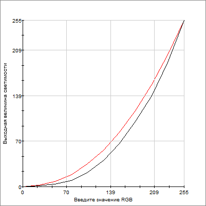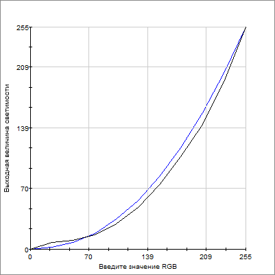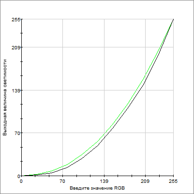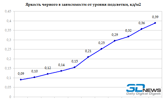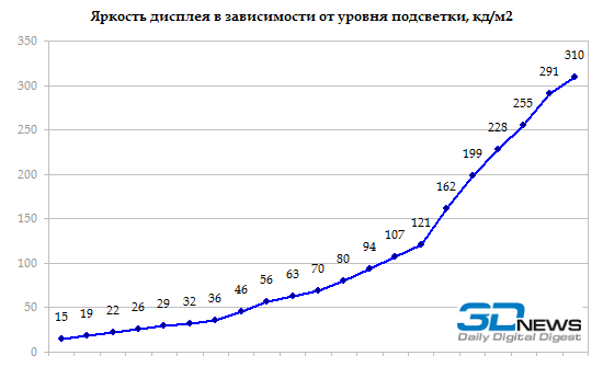 Яркость дисплея довольно высокая, но не рекордная. При максимальном уровне подсветки она составляет чуть больше 300 кд/м2. Любопытно, что диапазон регулировки весьма обширен: доступен 21 уровень подсветки. Правда, как можно видеть на графике, вторая, «более темная» половина диапазона практически бесполезна — яркость на этом промежутке меняется крайне мало.