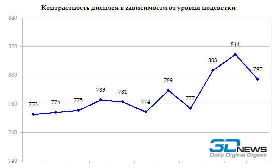 При максимальном уровне подсветки светимость черного поля в центре дисплея составляет 0,39 кд/м2, в самой яркой части — 0,59. Это невероятно мало по меркам мобильных дисплеев, как правило, данный показатель в разы больше. А на второй половине диапазона регулировки она падает настолько сильно, что используемый нами прибор уже не способен ее адекватно измерить.