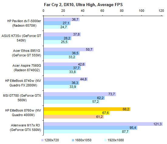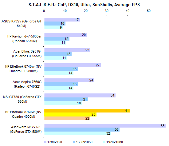 На несколько дополнительных кадров в секунду по сравнению с «младшим родственником» в случае с Quadro 4000M вполне можно рассчитывать. Но существенной разницы нет. Впрочем, оба адаптера по меркам ноутбуков отнюдь не медленные: разница с мейнстрим-решениями — GeForce GT 540M и 555M или Radeon 6570M и «гибридным» 6740G2 –кардинальная.