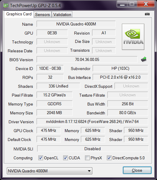 | Графический контроллер | NVIDIA Quadro 4000M (336 процессоров, 475 МГц), 2 Гбайт GDDR5 (4x625 МГц, шина 256 бит) |