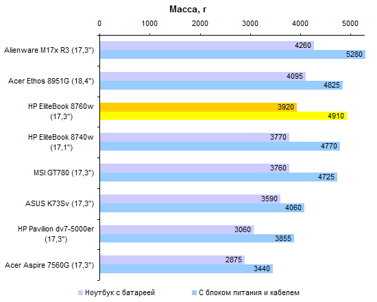 Ноутбук существенно тяжелее обычных домашних «семнашек». И даже по меркам высокопроизводительных моделей он весит довольно много: почти 4 килограмма вместе с аккумулятором и без малого 5 кило вместе с блоком питания и силовым кабелем.