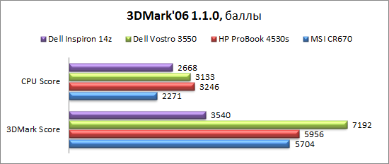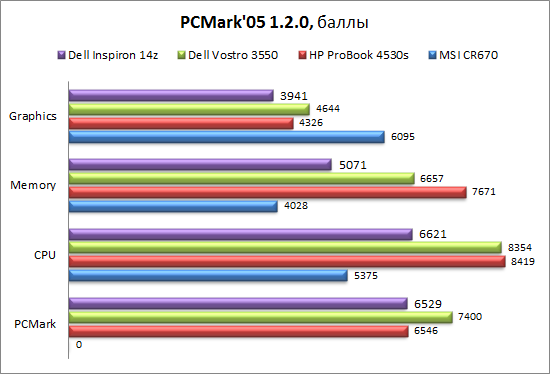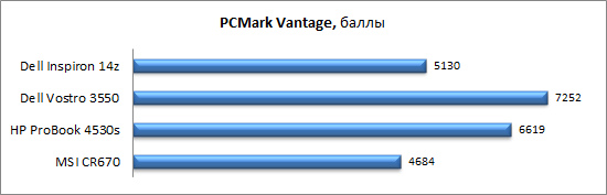 ⇡#Тестирование — уровень шума и тепловой режимКакие из элементов, активно выделяющих тепло, есть у тестируемого ноутбука? Процессор с максимальным TDP 35 ватт, память да жёсткий диск. Вот, собственно, и всё. Вентиляционных отверстий достаточно, днище плоское, вес для 14-дюймового ноутбука стандартный, то есть на радиаторах в данном случае не экономили. Теоретически никаких проблем с охлаждением и высоким уровнем шума быть не должно. В режиме простоя уровень шума не превышает 32,7 дБА, чего для комфортной работы вполне достаточно. Однако 36,5 дБА достигается уже при малейших и кратковременных нагрузках. Например, кулер раскручивается до второй скорости при загрузке бенчмарка 3DMark 2006. Далее при увеличении нагрузки уровень плавно, но стремительно растёт до 39,0 дБА и достигает максимума на отметке 41,1 дБА. Причём максимальный уровень шума достижим даже при просто высоких, не максимальных нагрузках. Ниже приведена сводная диаграмма уровня шума в режиме простоя и в режиме максимальной нагрузки для ноутбуков MSI CR670, HP ProBook 4530s, Dell Vostro 3550 и тестируемого ноутбука.  Замер уровня нагрева производится при комнатной температуре (+21 градус Цельсия) для девяти точек днища и рабочей области. После часового циклического запуска пакета 3DMark 06 температура рабочей области в зависимости от точки измерения составила 24-33 градуса Цельсия, а днища — 26-38 градусов. ⇡#Тестирование — производительностьДля сравнения уровня производительности в качестве оппонентов были выбраны следующие ноутбуки: