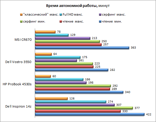 ⇡#Тестирование — время автономной работыДля Inspiron 14z доступны два типа аккумуляторов. Первый обладает емкостью 44 Вт*ч и полностью помещается в своем отсеке. В нашем случае ноутбук был укомплектован более солидной батареей емкостью 62 Вт*ч. Однако у нее есть недостаток — она не помещается в отсеке и слегка выпирает снизу. Тестирование времени автономной работы проводилось в пакете Battery Eater Pro в режимах «классический» с максимальной яркостью подсветки и «читательский» с минимальной и максимальной яркостью подсветки. А также при просмотре Full HD-видео с максимальным уровнем яркости и в режиме интернет-серфинга как с максимальной, так и минимальной яркостью подсветки.  ⇡#ВыводыНоутбук заключён в эффектный корпус с металлической крышкой и рабочей областью, кроме того, интересным решением, по крайней мере с точки зрения внешнего вида, является установка заглушек практически на все порты и разъёмы. Металлические поверхности хорошо сопротивляются царапинам и потертостям, но отпечатки пальцев собирают мгновенно. Из минусов стоит отметить недостаточную жёсткость корпуса и прогибающееся основание клавиатуры. Дисплей в Dell Inspiron 14z недорогой, соответственно, углы обзора невелики, а контрастность низка. Ну хоть неравномерность подсветки укладывается в 20%. Впрочем, это норма для сравнительно недорогих ноутбуков. Несмотря на отсутствие логотипа JBL, встроенные динамики звучат вполне пристойно, а качество звука на аналоговом выходе заслужило в пакете RMAA оценку «очень хорошо». Также из плюсов стоит отметить достаточно приличные результаты в тесте времени автономной работы. Благодарим компанию МУК (г. Киев) за предоставленное для тестирования оборудование. Также благодарим компанию «Графитек» (г. Москва) за предоставленный комплект колориметров Spyder3Studio.