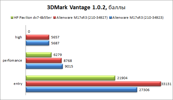 | 3DMark Vantage | Alienware M17x R3210-34923 | Alienware M17x R3210-34927 | HP Pavilion dv7-6b55er | ||||||