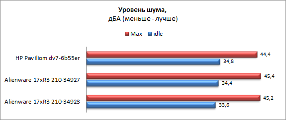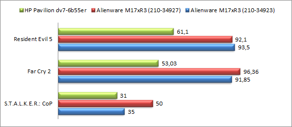 К сожалению, HP Pavilion dv7-6b55er оборудован матрицей, не поддерживающей разрешение 1280х720 точек, в котором были протестированы ноутбуки Alienware M17x R3, поэтому использовалось максимально близкое из доступных — 1366х768 точек.