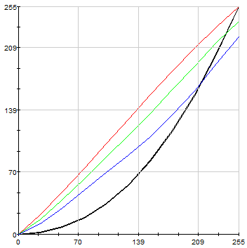 На иллюстрациях, приведённых ниже, изображены гамма-кривые (чёрные графики), полученные до и после калибровки дисплея, целевая гамма 2,2 (светло-синий график) и коррекция для каждого цвета (красный, синий, зелёный).