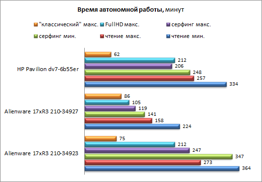 В HP Pavilion dv7-6b55er используется 6-элементный аккумулятор емкостью около 62 Вт*ч. Тестирование времени автономной работы проводились в пакете Battery Eater Pro в режимах «классический» с максимальной яркостью подсветки и «читательский» с минимальной и максимальной яркостью подсветки. Также замеры производилось при просмотре Full HD-видео с максимальным уровнем яркости и в режиме интернет-серфинга как с максимальной, так и с минимальной яркостью подсветки.