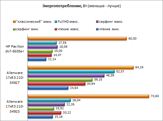 Ниже приведена сравнительная диаграмма, демонстрирующая примерное энергопотребление, пересчитанное из измеренных значений времени автономной работы.