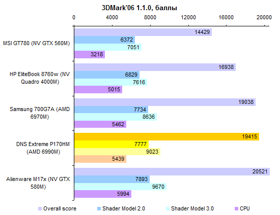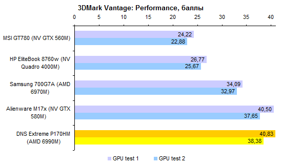 В более свежем пакете 3DMark Vantage старший мобильный адаптер AMD смотрится особенно хорошо: он не только серьезно отрывается от младшего брата, но и обгоняет GeForce GTX 580M.