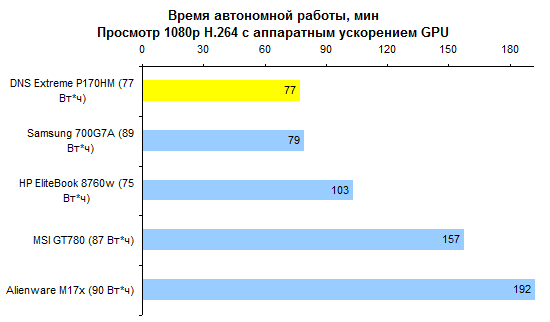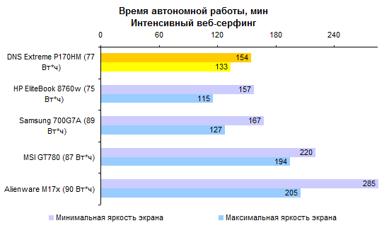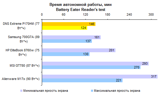 Графическая система DNS Extreme P170HM не поддерживает переключение на интегрированный адаптер. Да и прочие компоненты не самые экономичные. Результат закономерен — ноутбук способен проработать в лучшем случае два с половиной часа.