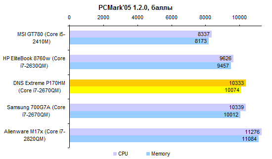 Все сравниваемые ноутбуки, кроме одного, оснащены четырехъядерными процессорами Intel. Разница в результатах PCMark’05 не особенно велика.