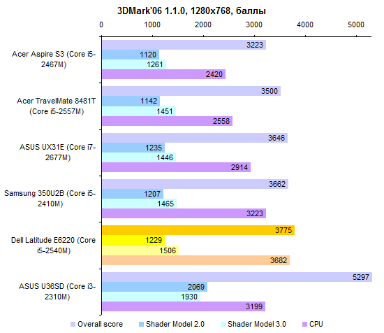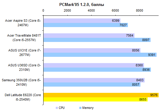 Ноутбук весьма недешевый, поэтому на процессоре в Dell экономить не стали. С вполне логичным результатом: Latitude E6220 обгоняет в тестах производительности все сравниваемые ноутбуки.
