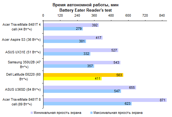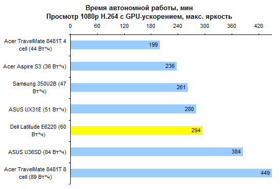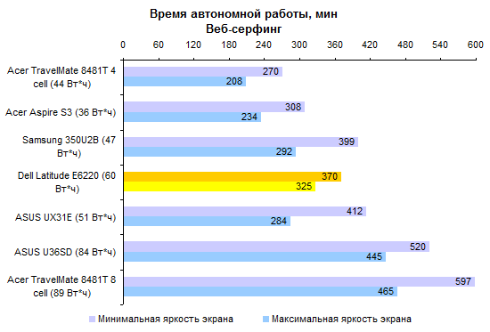 От 6-элементного аккумулятора Dell Latitude E6220 работает вполне приличное время, хотя до чемпионов нашей тестовой лаборатории ему далеко.