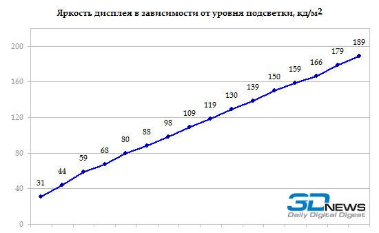 Яркость дисплея средняя — в центре экрана при максимальном уровне подсветки она составляет 189 кд/м2. Что любопытно, точно такой же максимальной яркостью обладал 12,5-дюймовый дисплей Samsung 350U2B. Хотя матрица там была другая — Samsung LTN125AT03.