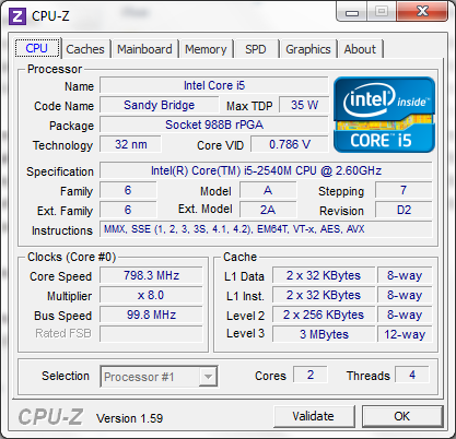 | Процессор | Intel Core i5-2540M: 2,6 ГГц (до 3,3 ГГц в режиме Turbo Boost); 2x256 Кбайт L2; 3 Мбайт L3; два вычислительных ядра |