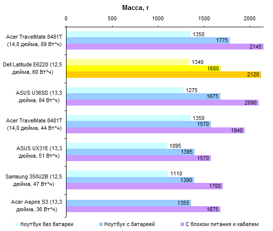 Если же сравнивать с уже упоминавшимся выше одноклассником, Samsung 350U2B, то разница в массе ноутбуков с аккумуляторами составляет аж 300 грамм — и даже все 400, если учитывать вес полного комплекта, с блоком питания. Про ультрабуки и говорить не будем.