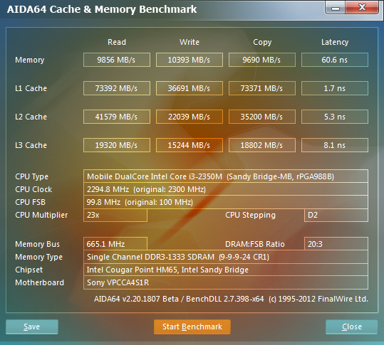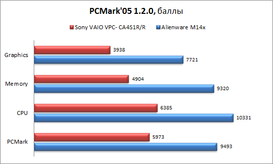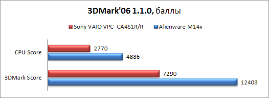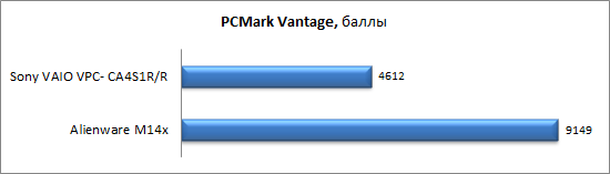 ⇡#Тестирование: уровень шума и тепловой режимМаксимальный уровень шума системы охлаждения VAIO CA4 нельзя назвать низким, он составляет 40,3 дБА. Довольно шумно для 14-дюймового ноутбука, основанного на далеко не самых мощных комплектующих. Однако алгоритм работы охлаждающей системы столь хорошо продуман, что шум практически не мешает нормальной работе. Как таковых ярко выраженных ступеней нет, уровень шума изменяется крайне плавно и незаметно для пользователя. Но всё же можно выделить несколько уровней, на которых система охлаждения имеет тенденцию задерживаться, – это минимальный 34,5 дБА, а также 35,6 дБА и 36,3 дБА, 38,2 дБА. Стоит отметить, что даже при максимальной нагрузке для набора скорости от предпоследнего до максимального уровня требуется 20 секунд, а при прекращении высокой нагрузки вентилятор плавно, но значительно быстрее и практически без паузы сбрасывает обороты. Замер уровня нагрева производится при комнатной температуре (+21 градус Цельсия) для 9 точек днища и рабочей области. После часового циклического запуска пакета 3Dmark 2006 температура рабочей области в зависимости от точки измерения составила 22-32 градуса Цельсия, а днища – 24-35 градусов.   ⇡#Тестирование: производительностьДля сравнения производительности мы взяли недавно протестированный 14-дюймовый ноутбук Alienware M14x. Конфигурация этой модели заметно серьезнее: процессор Core i7-2670QM и графическая система NVIDIA GeForce GT555M 3 Гбайт.