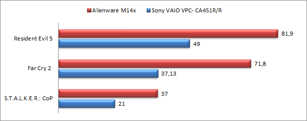 Производительность системы также была измерена в играх «S.T.A.L.K.E.R.: Зов Припяти», Resident Evil 5 и Far Cry 2 при помощи распространяемых с играми тестовых пакетов. В бенчмарке Far Cry 2 тестовая сцена Ranch Long запускалась пять раз, в таблицы результатов вносились усреднённые данные пяти запусков, бенчмарки «S.T.A.L.K.E.R.: Зов Припяти», Resident Evil 5 запускались единожды, так как в них не предусмотрена возможность выбора количества циклов.
