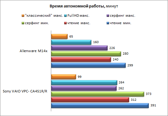 ⇡#Тестирование: время автономной работыВ Sony VAIO VPC-CA4S1R/R используется 6-элементный аккумулятор емкостью около 59 Вт*ч. Как и следовало ожидать при такой начинке и такой батарее, ноутбук обладает вполне приличным запасом автономности.  ⇡#ВыводОсновная фишка ноутбука – это его внешний вид, яркий и необычный. Кроме того, у ноутбука отличная клавиатура с равномерной белой подсветкой. Также VAIO CA4 может предложить своему владельцу хорошее качество звучания на аналоговом аудиовыходе и достаточно длительное время автономной работы. Но не все так радужно. Дисплей совершенно не впечатлил качеством изображения, встроенные динамики проигрывают даже некоторым смартфонам, да и уровень шума охлаждающей системы довольно высок. Кроме того, все представители линейки Sony VAIO CA довольно дорого стоят, и данная модель не исключение. Благодарим украинское представительство Sony за предоставленное для тестирования оборудование. А также компанию «Графитек» г.Москва за предоставленный комплект колориметров Spyder3Studio.