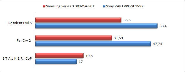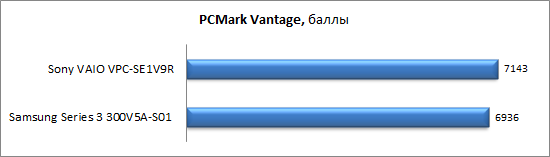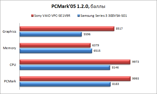 ![]() До суммарной оценки «отлично» Samsung 300V5A не хватило совсем немного — весьма достойный результат для недорогого ноутбука. ⇡#Тестирование: уровень шума и тепловой режимВ режиме чтения ноутбук проявил себя настоящим тихоней — при таком сценарии использования уровень шума не поднимается выше 31,2 дБА, что едва заметно даже в тихом помещении. Но стоит только немного нагрузить устройство, как у него сразу прорезается «голос». Например, при запуске Windows Media Player уровень шума на мгновение скачкообразно достигает отметки 35,0 дБА, после чего опускается до 33,3 дБА. Если в проигрывателе открыть mp3-файл, то уровень шума будет ещё некоторое время держаться на отметке 33,3 дБА, после чего снизится до минимума. Но если открыть Full HD-видео, то уровень шума в процессе просмотра иногда поднимается до 37,6 дБА. Максимальная измеренная громкость работы системы охлаждения составила 40,2 дБА — при высокой нагрузке этот уровень достигается достаточно быстро. Всего же алгоритм работы охлаждающей системы предусматривает семь скоростей вращения крыльчатки кулера, при которых уровень шума составляет 31,6 дБА, 33,3 дБА, 36,2 дБА, 37,6 дБА, 38,5 дБА и максимальные 40,2 дБА. Скорость вращения изменяется довольно часто и резко, что не особенно способствует акустическому комфорту. Во время тестирования нам также удалось ознакомиться с аналогичным ноутбуком, но на базе процессора Intel Core i3-2330M. И хоть TDP последнего не намного ниже (35 против 45 Ватт), общая шумность ноутбука, а также количество переключений скоростей вращения у данной конфигурации Samsung 300V5A оказались значительно меньше. Замер уровня нагрева производился при комнатной температуре (+21 градус Цельсия) для 9 точек днища и рабочей области. После часового циклического запуска пакета 3DMark 2006 температура рабочей области в зависимости от точки измерения составила 24-35 градусов Цельсия, а днища — 23-45 градусов. Горячая штучка. Аналогичный ноутбук на базе процессора Intel Core i3-2330M оказался заметно менее горячим — к сожалению, снять точные показания не удалось, пришлось ограничиться субъективными впечатлениями. ![]() ⇡#Тестирование: производительностьПрямых конкурентов Series 3 300V5A на тестировании у нас не еще было, поэтому для сравнения производительности был взят несоизмеримый по стоимости тонкий 15,5-дюймовый ноутбук Sony VAIO VPC-SE1V9R, который основан на базе Intel Core i7-2640M и видео ATI Radeon 6630M c 1 Гбайт набортной памяти. ![]() ![]()