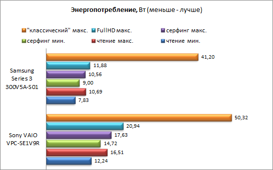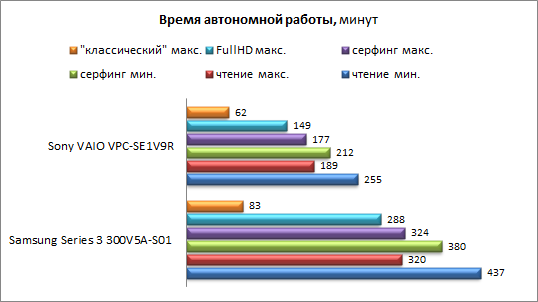 ⇡#Тестирование: время автономной работыВ Samsung 300V5A-S01 используется обычный съемный аккумулятор, простроенный на цилиндрических элементах питания. Емкость по меркам бюджетных ноутбуков неплоха — 57 Вт*ч, но следует иметь в виду, что мы получили для тестов не совсем стандартную модификацию, а в продажу модель поступит с АКБ на 48 Вт*ч. ![]() ![]() Благодаря отличной оптимизации энергопотребления и солидной емкости аккумулятора ноутбук может похвастаться весьма неплохим запасом хода. В стандартных для мобильного использования режимах он способен без проблем прожить 5-6 часов. ⇡#ВыводНоутбуки Samsung Series 3 — это по определению «рабочие лошадки», которым лишние украшательства не положены. Тем не менее Samsung 300V5A выглядит хорошо, его внешность даже можно назвать интересной. Также из плюсов стоит отметить хорошее качество звука на аналоговом аудиовыходе, сравнительно невысокую цену, длительное время автономной работы и высокую производительность. Из недостатков необходимо упомянуть невысокую контрастность дисплея (хотя у него есть и небольшой плюс — приличная яркость), не особенно комфортный алгоритм работы охлаждающей системы и довольно высокий уровень нагрева корпуса. Однако в модификациях на процессоре Core i3 уровень шума и нагрева значительно меньше, а благодаря гораздо более низкой цене уже можно не сильно придираться к качеству дисплея. Да и производительность видеоподсистемы, одинаковой во всех модификациях 300V5AH, такому процессору соответствует гораздо больше. Резюмируем: если нужен добротный и сравнительно недорогой ноутбук с хорошими показателями автономной работы и приятным для данной ценовой категории дизайном, то Samsung 300V5A будет вполне логичным выбором. Но только в версии с процессором Intel Core i3 — собственно, такие конфигурации в основном и представлены на прилавках отечественных магазинов. Благодарим украинское представительство компании Samsung за предоставленный для тестирования ноутбук. Также редакция 3DNews благодарит компанию «Графитек» за предоставленный в распоряжение нашей лаборатории измерительный комплекс Spyder3Studio.