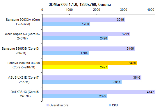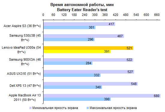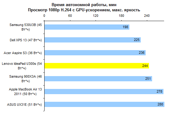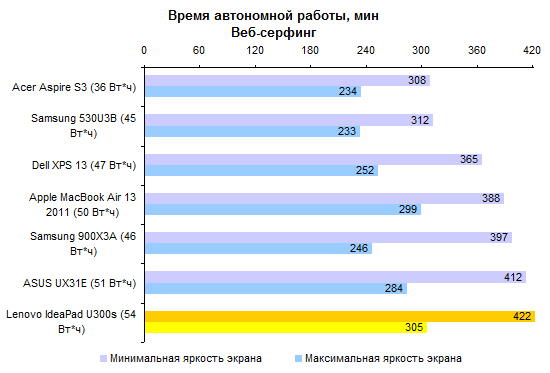 ⇡#Тестирование: время автономной работыВ IdeaPad U300s, как и во всех остальных ультрабуках, использован несъемный аккумулятор, основанный на плоских элементах питания. Емкость не такая низкая, как у некоторых других представителей данной категории устройств: 54 Вт*ч. Поэтому от батареи ультрабук Lenovo работает достаточно долго. ![]() ![]() ![]() Одна из особенностей Lenovo IdeaPad U300s — возможность зарядки аккумулятора до 50% ёмкости за 30 минут. Заявленное компанией значение подтвердилось на практике. Более того, аккумулятор заряжается до 95% ёмкости всего за 66 минут, а последние 5% заряжаются ещё столько же. Так что почти полный заряд доступен уже фактически через час. ![]() ⇡#ВыводСлабые стороны Lenovo IdeaPad U300s — это отсутствие устройства чтения карт памяти, плохой дисплей, далеко не самый приятный тачпад, а также нагрев корпуса — хоть и в пределах нормы, но чуть выше среднего. Кроме того, нельзя не отметить довольно маркие поверхности крышки и днища ультрабука и глянцевое покрытие дисплея. К достоинствам же следует отнести все плюсы ультрабуков: малую толщину и вес, очень быструю загрузку системы и все прочие радости жизни, предусмотренные компанией Intel. В отличие от некоторых других ультрабуков, IdeaPad U300s может похвастаться еще и неплохим временем автономной работы. Отдельного внимания заслуживают добротные встроенные динамики и низкий уровень шума, генерируемого охлаждающей системой ультрабука. Также стоит отметить качественную клавиатуру и резиновую накладку по периметру дисплея — она не только увеличивает сохранность ЖК-дисплея, но и защищает ноутбук от попадания пыли при транспортировке. Непосредственно после старта продаж в компании Lenovo поставили на свой первый ультрабук достаточно устрашающий ценник. Но к данному моменту IdeaPad U300s успел изрядно подешеветь, так что его привлекательность серьезно увеличилась. Благодарим украинское представительство компании Lenovo за предоставленный для тестирования ноутбук. Также редакция 3DNews благодарит компанию «Графитек» за предоставленный в распоряжение нашей лаборатории измерительный комплекс Spyder3Studio.