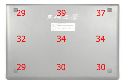 ![]() ⇡#Тестирование: уровень шума и тепловой режимВ режиме простоя и даже при длительных средних нагрузках уровень шума чаще всего не превышает 31,9 дБА. Это едва заметно даже в тихом помещении, а уж если работает хотя бы очень тихий холодильник или кондиционер, то шум ноутбука на фоне неразличим вовсе. Но «прогревается» система охлаждения довольно быстро: даже при недолгих высоких нагрузках уровень шума подбирается к отметке 32,5 дБА. Третий уровень достигается только при длительных максимальных нагрузках и составляет всего-навсего 34,5 дБА. Измерения проводились при температуре окружающей среды 21 градус Цельсия, что является необходимым условием нашей методики. Но что если температура будет выше? Всё же вентиляционная решётка невелика, на днище вентиляция вовсе не предусмотрена. Для определения максимально возможного уровня шума единственная вентиляционная решётка была заклеена липкой лентой, а на ноутбуке был запущен тест стабильности системы, который очень сильно её нагружает. В итоге уровень шума достиг отметки 37,0 дБА. Сам по себе результат не критичный, к тому же он был получен в далеко не штатных режимах работы, поэтому в зачёт идёт весьма скромный уровень шума в 34,5 дБА. Замер уровня нагрева производится при комнатной температуре (+21 градус Цельсия) для 9 точек днища и рабочей области. После часового циклического запуска пакета 3DMark 2006 температура рабочей области в зависимости от точки измерения составила 26-38 градусов Цельсия, а днища — 29-39 градусов. В общем, корпус немного горячее, чем у классических ноутбуков с соизмеримой производительностью, но всё же не стоит забывать о сверхмалой толщине и небольшой массе устройства, которые просто не позволяют установить более эффективную систему охлаждения. ![]() ⇡#Тестирование: производительность