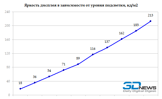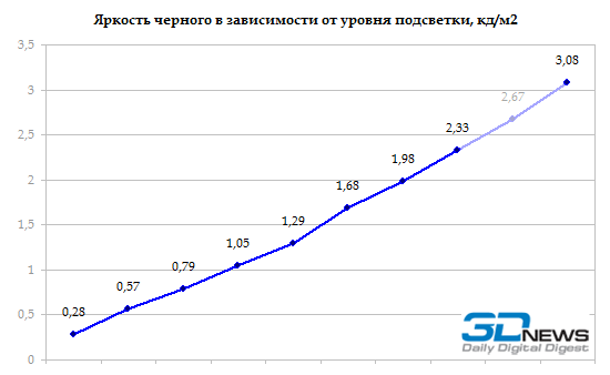 В одном из измерений (90% подсветки) светимости черного у нас получился плохой результат, который в спешке — ультрабук попал к нам всего лишь на один уикенд — мы не заметили и не успели переснять. Соответствующая точка на графике (более бледная, чем остальные) построена методом подгонометрии и может не вполне соответствовать реальности.