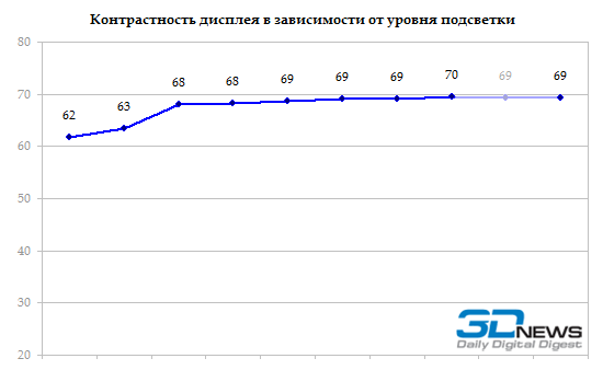 Так или иначе максимальная светимость черного составляет чуть больше 3 кд/м2. Что в итоге дает нам примерное значение контрастности — около 70:1.