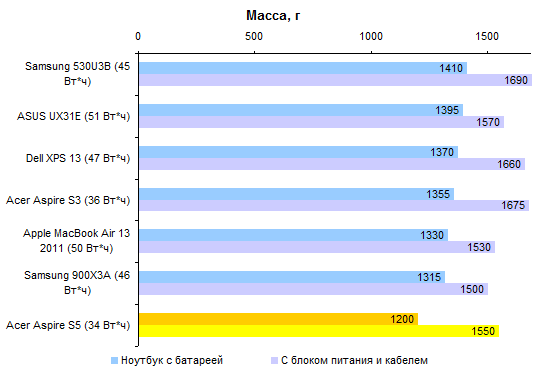 В Acer Aspire S3 использовался 3-элементный аккумулятор. В Aspire S5 количество элементов выросло до четырех. Но сами «ячейки» гораздо более тонкие и менее емкие. Так что суммарная емкость даже немного снизилась: с 36 до 34 Вт*ч.