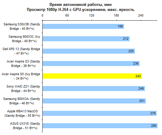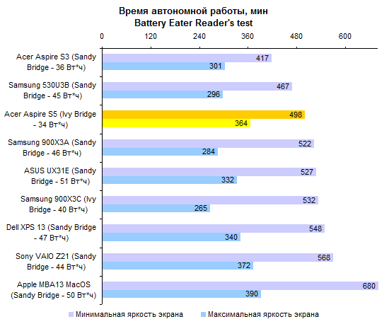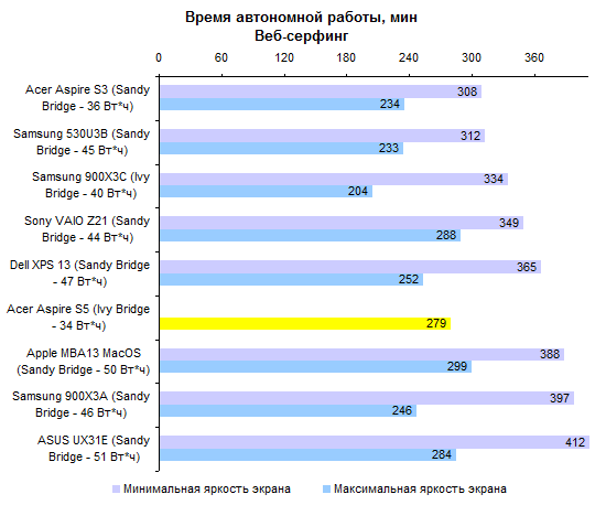 Несмотря на снизившуюся емкость аккумулятора, время автономной работы по сравнению с Aspire S3 немного увеличилось. Судя по всему, спасибо за это следует сказать не процессорам Intel на ядре Ivy Bridge, а чрезвычайно тщательной оптимизации энергопотребления. Экономичному дисплею, твердотельному накопителю и так далее.