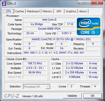 Процессор Intel Core i7-3517U: 1,9 ГГц (до 3,0 ГГц в режиме Turbo Boost); 2x256 Кбайт L2; 4 Мбайт L3; два вычислительных ядра