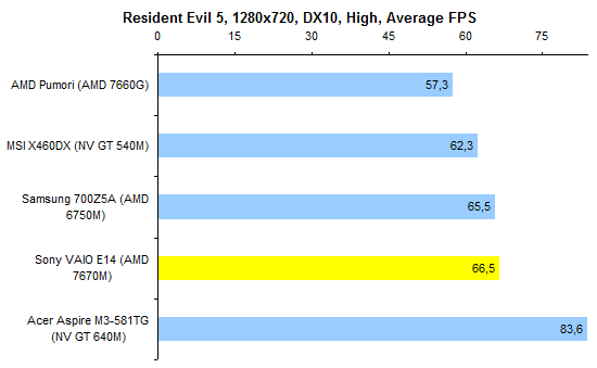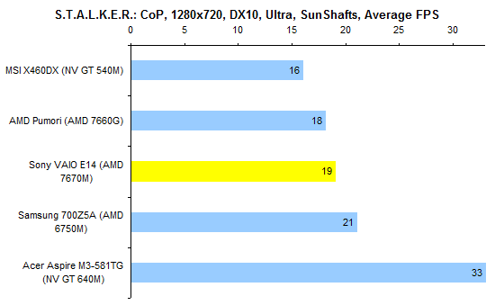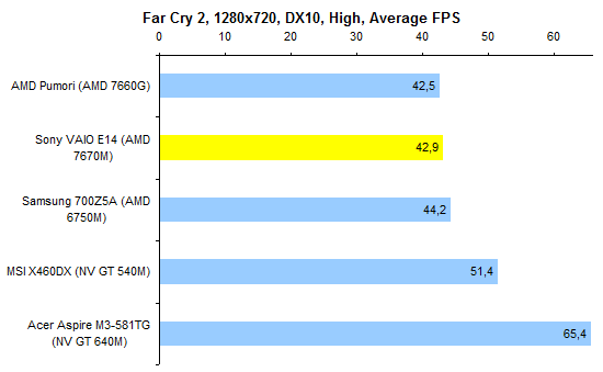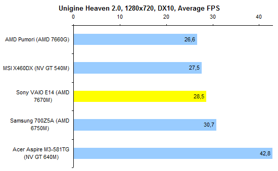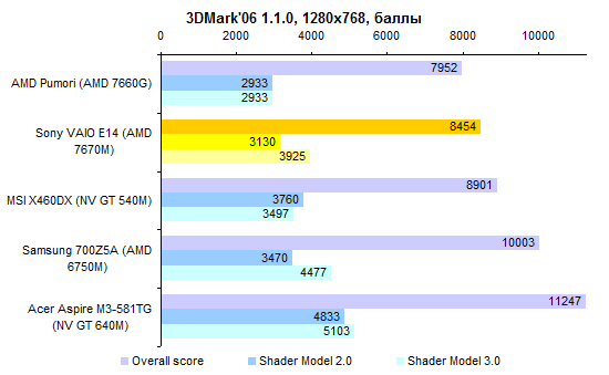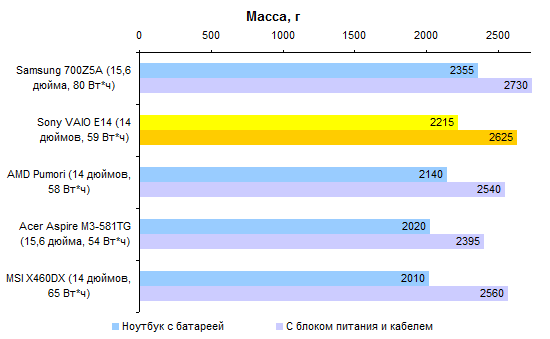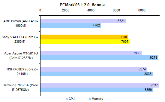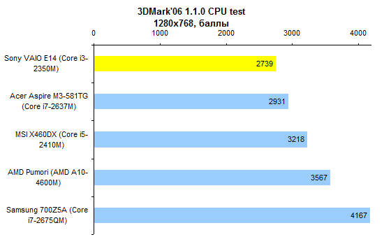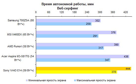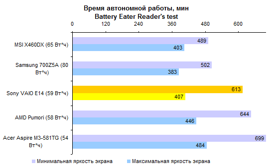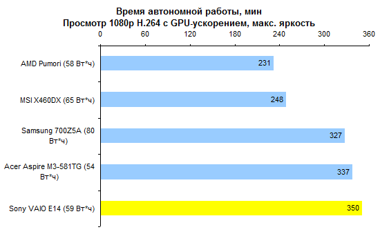Из-за отсутствия поддержки Turbo Boost процессоры Intel Core i3 проигрывают даже ULV-модели.   Кажется, нам становится ясна логика переименования Radeon 6650M в Radeon 7670M: это все для того, чтобы можно было присвоить более «вкусный» номер модели графическому адаптеру, встроенному в процессор AMD A10-4600M.    Представьте, что эту модель назвали бы Radeon 7650M или, упаси Создатель, даже Radeon 7550M, как вообще-то стоило. Как бы тогда в AMD объяснили покупателям, почему интегрированный Radeon 7660G медленнее? А тут — смотрите, как все стройненько!   Ну а то, что оба этих «вкусных» на вид решения новый адаптер NVIDIA GeForce 640M буквально рвет на тряпки — так на это надо просто не обращать внимания. Подумаешь, какие мелочи. ⇡#Тестирование — масса, время автономной работыВ предыдущих моделях сравнительно недорогой серии VAIO E японцы использовали весьма посредственные аккумуляторы, со всеми вытекающими последствиями. В обновленном модельном ряду на этом компоненте, похоже, решили не экономить. Скажем, Sony VAIO E14 оснащают 6-элементной батареей на цилиндрических элементах питания вполне приличной емкости — 59 Вт*ч. Блок питания — типичный для подобных конфигураций адаптер мощностью 90 Вт. Размеры его достаточно велики, масса составляет более 300 грамм. Масса VAIO E14 заставляет вспомнить «нулевые»: 2,2 килограмма с небольшим. Сейчас таких увесистых 14-дюймовых моделей уже почти не делают. С учетом блока питания ноутбук потянет на все 2,6 кило. Собственно, сейчас существует немало «пятнашек», которые весят меньше, — у той же Sony такая есть.  Чем нас эта модель ноутбука по-настоящему поразила — это временем автономной работы. Не очень понятно, зачем настолько тщательно оптимизировать энергопотребление ноутбука, который из-за массы вряд ли кто-то соберется всерьез использовать вдали от розетки. Но японцы это сделали. В режиме минимального энергопотребления VAIO E14 умеет работать до 10 с небольшим часов.  Но гораздо больше нас впечатлило минимальное падение времени автономной работы в режиме работы с веб-страницами через Wi-Fi. С искусством «замораживать» процессор в простое мы уже неоднократно сталкивались. А вот настолько аккуратное обуздание аппетитов ноутбука при работе с беспроводной сетью встречаем, кажется, впервые.  Почти 6 часов просмотра Full HD-видео тоже впечатляют. Между прочим, это рекорд среди ноутбуков с полноценным (не ULV) процессором и обычным 6-элементным аккумулятором.  Над обеспечением запаса хода — как оптимизацией энергопотребления, так и «грубой силой»: емкостью аккумулятора — разработчики VAIO E14 потрудились отменно. В результате получился один из самых долгоживущих ноутбуков в своем классе. ⇡#ВыводыУ данной модели есть два недостатка: слишком гибкая клавиатура и слишком высокая масса. Учитывая, что ноутбук явно женский, второй недостаток представляется нам действительно существенным, особенно при текущей цене. Мужчина мог бы польститься на внешнюю графику или действительно выдающееся время автономной работы VAIO E14. Но мужчина не купит себе розовый ноутбук. Что выберет представительница прекрасного пола: тонкий и практически невесомый ультрабук или упитанный Sony VAIO E14? Кажется, ответ очевиден. Тем более что на крышках некоторых ультрабуков теперь тоже встречается логотип VAIO — и как раз за те же деньги. Редакция 3DNews благодарит компанию «Графитек» за предоставленный в распоряжение наш