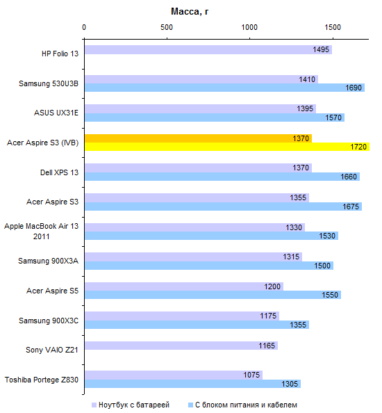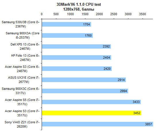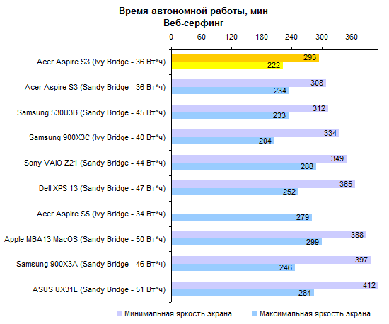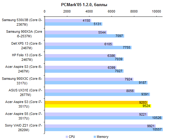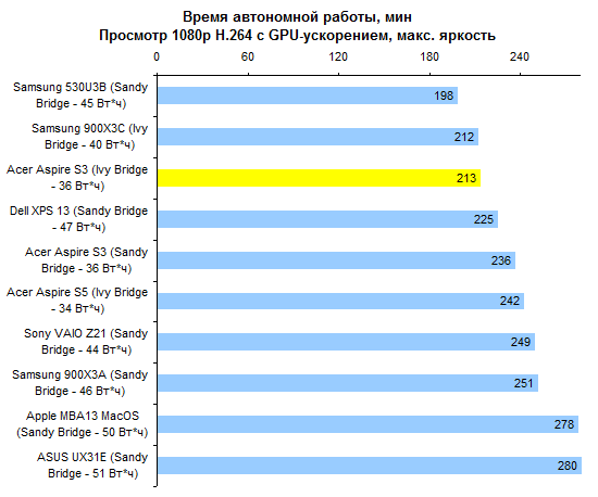 Протестированный экземпляр Acer Aspire S3 был оснащен дорогим процессором Core i7-3517U — с кешем L3 объемом 4 Мбайт, номинальной частотой 1,9 ГГц и возможностью динамического разгона в режиме Turbo Boost до 3 ГГц. ![]() ![]() В российской рознице будет также представлена и менее дорогая конфигурация с Core i5-3317U (1,7/2,6 ГГц; 3 Мбайт L3). Если учесть разницу цен, младшая версия представляет заметно больший интерес.