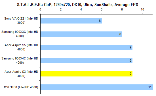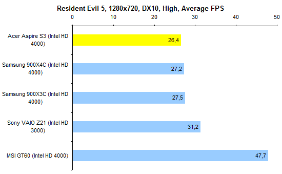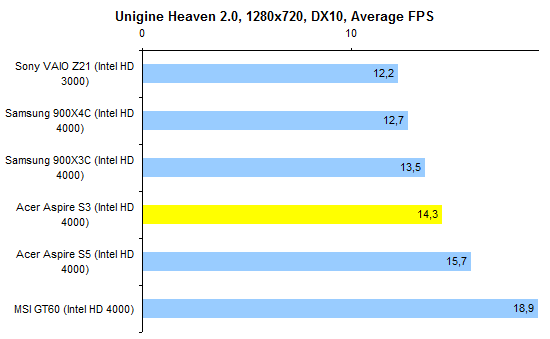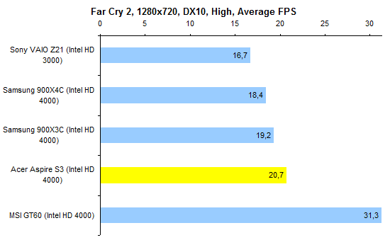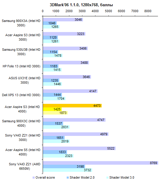 С процессором Core i7-3517U мы уже встречались в обзоре Aspire S5, с тех пор он особенно не изменился. Процессор очень быстрый, его производительность примерно соответствует уровню лучших «полноразмерных» ЦП для ноутбуков прошлого поколения. Одним словом, если вы не занимаетесь чем-то специально-тяжелым вроде 3D-моделирования, то его мощности вам хватит с головой. ![]() ![]() С графикой, как и во всех остальных ультратонких ноутбуках на Ivy Bridge, дела обстоят не так уж гладко. Одно и то же графическое ядро, встроенное в одну и ту же модель процессора может получить кардинально разное количество очков в тесте: сравните результаты Aspire S3 и Aspire S5. ![]() Посмотрим чуть более пристально на то, какие результаты показывают ноутбуки с графическим ядром Intel HD 4000. Для этого добавим в конкуренты еще пару ноутбуков: Samsung 900X4C (просто для «массы») и крупный игровой ноутбук MSI GT60. Последний оснащен крайне производительным кулером, способным охлаждать неслабую внешнюю графику, так что мы можем быть уверены, что уж с интегрированным ядром его система охлаждения как-нибудь справится. А уж если не справится — то не выдюжит и любая другая. Таким образом, результаты MSI GT60 будем считать эталоном.