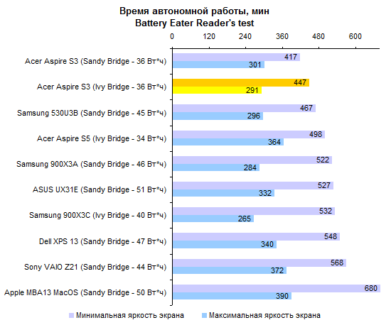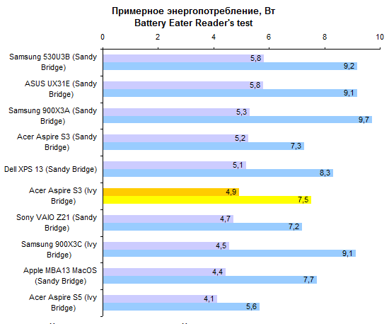 Теперь посмотрим, как покажут себя ноутбуки в игровых тестах. ![]() ![]() ![]() ![]() Соотношение сил изменяется совершенно неожиданно. Единственное, что остается неизменным, — это лидерство ноутбука с Core i7-3610QM. Напомним, мы имеем дело с одним и тем же графическим ядром, и потенциал динамического разгона этого ядра в случае Core i7-3610QM даже немного ниже. Почему же так получается? Как уже было сказано выше, гарантированной является именно номинальная частота работы графики, 350 МГц. Ядро может разгоняться, но может этого и не cделать, если процессор нагревается слишком сильно. В этом случае ГП рапортует: «Не шмогла я, хозяин, не шмогла» и сбрасывает обороты до номинала. Выглядит это следующим образом: Красивый частокол, не правда ли? Результат этих конвульсивных подергиваний между номинальной частотой 350 и разгоном до 950-1150 МГц — среднее арифметическое. То есть порядка 600-700 МГц. Примерно в таком соотношении и расположились результаты ультрабуков относительно большого ноутбука с производительной системой охлаждения. Вот что еще следует добавить. В нашем случае тестирование происходило при невысокой температуре в помещении (весна выдалась прохладной) и с дополнительным охлаждением в виде подставки-кулера, а время запуска отдельных тестовых сцен измерялось минутами, а не часами, как это происходит во время игры в реальной жизни. В менее благоприятных условиях можно ожидать еще больших потерь от потенциального максимума, чем зафиксировали мы. ⇡#Тестирование — время работы от аккумулятораАккумулятор совершенно не изменился по сравнению с оригинальным Aspire S3. Та же форма, то же количество элементов (три, но больших), совершенно идентичная емкость — 36,4 Вт*ч. Блок питания также не претерпел изменений. Acer по-прежнему комплектует свой недорогой ультрабук избыточно мощным 65-ваттным блоком питания, сравнительно крупным и тяжелым. Масса адаптера, как ни странно, немного изменилась: новый блок питания оказался на 25 грамм тяжелее, чем старый. Ноутбук также чуточку потяжелел, на 15 граммов. Ерунда, конечно. Но все эти мелочи вместе дают не очень радостную картинку. При формальной разнице в жалкие 40 грамм, в действительности — то есть вместе с блоком питания, без которого такие тонкие модели практически не живут — ультрабук Acer весит на 200 грамм больше, чем Apple MacBook Air 13. ![]() Теперь посмотрим на самое интересное: результаты тестирования времени автономной работы. Основное внимание следует обратить на сравнение старого и нового Aspire S3. Поскольку ультрабуки совершенно идентичны по дисплею и аккумулятору, в данном случае разница энергопотребления процессоров Sandy Bridge и Ivy Bridge можно оценить максимально корректно. ![]() ![]() И разница эта не в пользу Ivy Bridge. Новый ультрабук работает от батареи чуть-чуть меньше, чем старый. ![]() ![]() Энергопотребление повысилось примерно на 0,5-1 Вт. В зависимости от сценария использования это минус 10-20 минут. ![]() ![]() ⇡#ВыводыПроцессоры Core третьего поколения получились значительно более производительными, чем представители второго поколения, — и для низковольтных моделей это очень кстати. А вот энергопотребление не только не снизилось, но даже повысилось, если судить по результатам тестирования Acer Aspire S3. Повысилось незначительно, но все-таки. Системы охлаждения ультратонких ноутбуков категорически не способны обеспечить нормальную работу г
