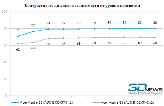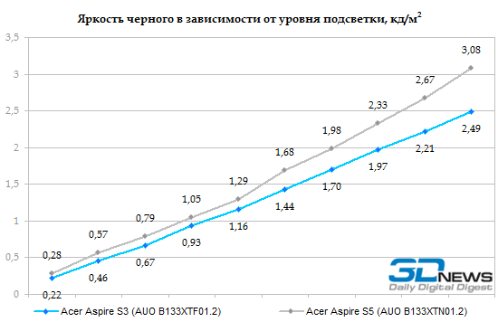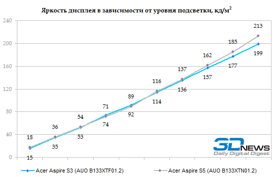Конфигурация накопителей осталась неизменной: Acer Aspire S3 по-прежнему рассчитан на использование обычного винчестера в сочетании с небольшим SSD, используемым под нужды системы — для ускорения запуска ОС и программ и для энергоэффективного «глубокого сна». В топовой версии используется только твердотельный накопитель, но, учитывая цену этой конфигурации, ее можно считать экзотикой — при таком бюджете можно присматриваться к ультрабукам более высокого уровня — тому же Acer Aspire S5, если не уходить далеко от заданного бренда. В Acer не стали экономить и сразу использовали южный мост Intel HM77, обладающий поддержкой USB 3.0. ![]() Во всех конфигурациях Aspire S3 объем памяти и ее тип одинаковы: 4 Гбайт DDR3-1600. Оперативка распаивается на материнской плате, разъемы расширения в данной модели не предусмотрены — так что нарастить объем не удастся. ![]() Разумеется, внешнего видеоадаптера для Aspire S3 не предусмотрено: обходиться придется исключительно встроенным в процессор графическим ядром Intel HD 4000. В ULV-процессорах Intel оно работает на низкой номинальной частоте (350 МГц). Теоретически графика может разгоняться до 1050/1150 МГц (Core i5-3317U и Core i7-3517U соответственно). Может, но не обязана: все зависит от того, насколько эффективна система охлаждения, поскольку Turbo Boost — это не гарантированный, а всего лишь потенциально возможный разгон. Гарантируется только номинальная частота, для процессорных ядер это также справедливо. ![]() Внутреннее строение ультрабука совершенно не изменилось. Материалы те же — магниево-алюминиевый сплав AZ91D и чуть-чуть пластика в тех местах, где нужна проницаемость для радиоволн. Компоновка также прежняя: в первую очередь это касается экзотической формы аккумулятора в виде трилистника. Соответственно, перекомпоновать остальные «запчасти» при жестко заданной геометрии в любом случае было бы проблематично. Конструкторы и не стали этого делать. Для того чтобы в тесный корпус поместился жесткий диск, хотя бы даже 7 миллиметров в толщину, конструкторы, как и прежде, использовали окошко в магниевом днище, закрытое тонкой стальной пластиной. В общем, внутри никаких изменений — только освежили используемые чипы. Новый процессор, новый южный мост, немного более быстрая память. Типичная эволюция. К услугам тех, кому хочется чего-то посвежеее, теперь естьAspire S5. Тоньше, легче и с мотором. ⇡#Тестирование — дисплейДаже дисплей остался тем же, что и в прошлом поколении: матрица AU Optronics B133XTF01.2 с диагональю 13,3 дюйма, разрешением 1366х768 и глянцевым покрытием (в Acer Aspire S5 использована чуть другая матрица — AU Optronics B133XTN01.2). Поскольку при рассмотрении оригинального Aspire S3 дисплей мы не тестировали, исправим это упущение. Экран обладает средней по нынешним меркам яркостью. По результатам наших измерений, светимость белого поля при максимальном уровне подсветки в центре дисплея составила около 199 кд/м2. ![]() Светимость черного поля в той же точке и с тем же уровнем подсветки сравнительно высока — почти 2,5 кд/м2. ![]() Таким образом, контрастность составляет порядка 80:1. Довольно типичный результат для матриц современных ноутбуков. Хотя бывает и значительно лучше, ультратонкая «тринашка» Samsung 900X3C тому прекрасный пример. ![]() Углы обзора традиционно невелики: даже при небольшом изменении положения головы относительно дисплея заметны снижение контрастности и деградация цветопе
