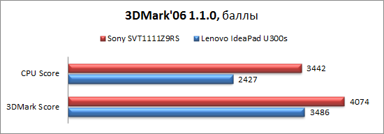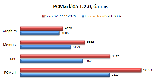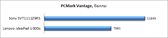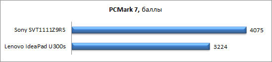 ![]() Как видим, результат весьма и весьма неплох, но до заветной оценки «отлично» далеко. Однако не стоит забывать, что на тестирование был предоставлен ознакомительный образец, а в коммерческих поставках ноутбуки обычно звучат чуть лучше. ⇡#Тестирование: уровень шума и тепловой режимК сожалению, на момент тестирования помещение, где проводились измерения, осталось без кондиционера. При температуре, даже ночью зашкаливающей за 28, этот факт сделал невозможным измерение температурных режимов — как компонентов, так и корпуса. Ограничимся краткими впечатлениями: греется ноутбук всё же не сильно, ведь при температуре воздуха 31,2 градуса практически вся поверхность ультрабука, работающего под нагрузкой, едва перевалила за 32 градуса, а в районе процессора — чуть за 40. Многие ноутбуки даже при более комфортных температурных условиях в районе процессора разогреваются за 40 градусов. К слову, таким перегревом при комнатной температуре грешат и некоторые нетбуки, соизмеримые по габаритам и весу с VAIO T11. Грех было не воспользоваться жаркой погодой и не провести стресс-тест. При температуре воздуха в тени 34 градуса ультрабук был выставлен под палящие лучи солнца, при этом на полчаса был запущен бенчмарк Furmark. Во время таких истязаний вентилятор практически сразу же раскрутился до максимальных оборотов. Но всё же ультрабук с честью прошёл испытание и температура компонентов осталась в границах допустимого, однако корпус при этом разогрелся до 52 градусов. Даже при настолько большой температуре окружающей среды VAIO T11 оставался тихим. При невысоких нагрузках, например прослушивании музыки, работе с офисным пакетом или несложной обработке графики, уровень шума на расстоянии 50 см от центра ближнего к пользователю края не превышал 32,2 дБА, а при высоких нагрузках достигал в пиках 37,1 дБА. Учитывая небольшие размеры устройства и, следовательно, затрудненный по сравнению с более крупными моделями отвод тепла, аналогичных результатов стоит ожидать и при комнатной температуре (+21 градус Цельсия), разве что максимальная скорость вращения вентилятора будет включаться чуть позднее. ⇡#Тестирование: производительностьВ качестве оппонента был выбран ультрабук Lenovo IdeaPad U300s, основанный на процессоре Intel Core i5-2467M со встроенным видеоадаптером Intel HD 3000. ![]()