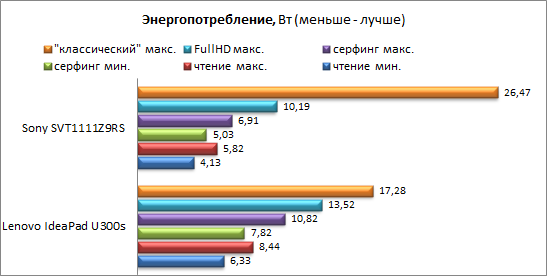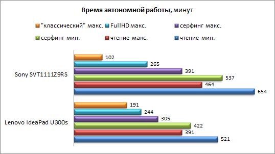 ⇡#Тестирование: время автономной работыВ ноутбуке тонкий аккумулятор, емкость которого составляет 45 Вт*ч. Разработчики как следует «похимичили» с оптимизацией энергопотребления. Так что даже от такой батареи VAIO T11 способен проработать достаточно долго. Едва ли не 11 часов в режиме минимальной нагрузки и от 4,5 до 9 часов в более реалистичных режимах. ![]() В целом в наиболее востребованных режимах примерное энергопотребление на 2-3 Вт ниже, чем у Lenovo IdeaPad U300s. Само собой, отчасти это связано с меньшим размером дисплея. Но в основном сказываются именно старания по части оптимизации расхода энергии. ![]() ⇡#ВыводПо меркам 11-дюймовых моделей Sony VAIO SVT11 получился достаточно крупным и тяжелым. Кроме того, в данном случае в Sony предпочли сэкономить на дисплее. Так что качество изображения совсем не впечатляет. Отчасти выручает невысокая цена — в минимальной конфигурации VAIO T11 стартует от весьма демократичных 25 тысяч рублей. Но за эти деньги вы получите совсем слабенький процессор и традиционный жесткий диск вместо SSD (в придачу к маленькому SSD, если быть точным. — прим. ред.). А вот цены на протестированную конфигурацию уже ощутимо кусаются. Впрочем, не все так плохо: у 11-дюймового ультрабука VAIO есть и серьезные достоинства. Во-первых, богатейший по сравнению с одноклассниками набор совершенно стандартных портов. Во-вторых, пристойное звучание встроенных динамиков — благодаря функции Sony xLOUD они звучат на удивление громко. Наконец, в-третьих: VAIO T11 действительно долго работает от аккумулятора. При желании и без того немалое время работы можно удвоить — ведь батарея съемная, так что ее без проблем можно заменить запасной. Редакция 3DNews благодарит компанию «Графитек» за предоставленный в распоряжение нашей лаборатории измерительный комплекс Spyder4Elite.