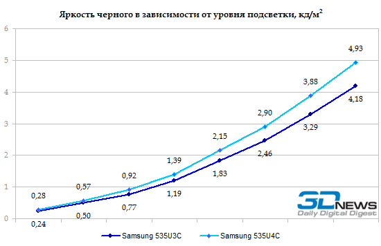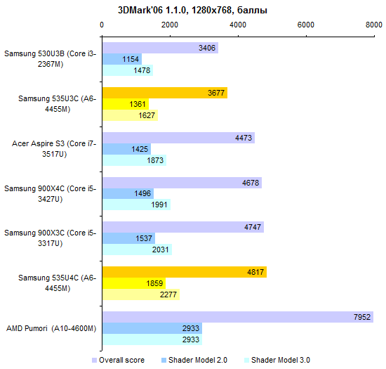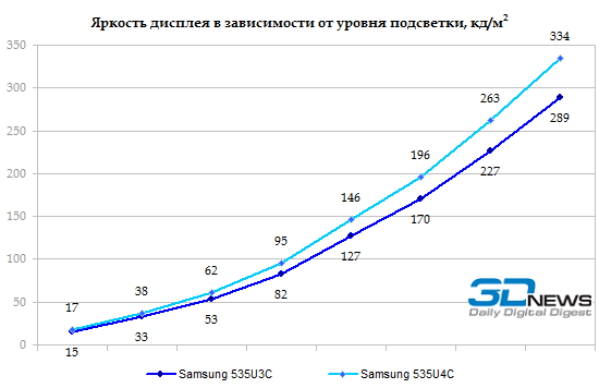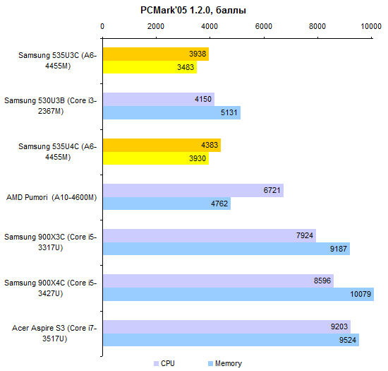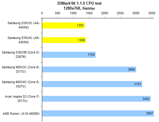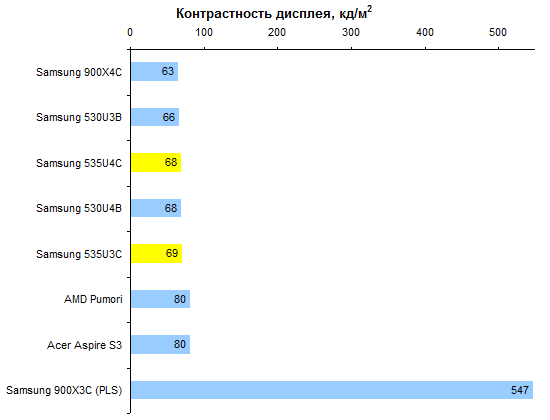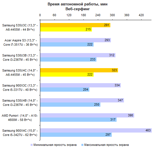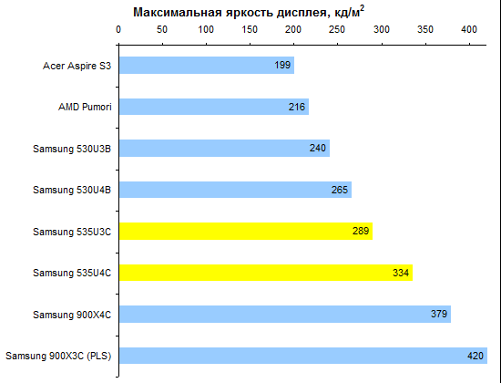 Обе протестированные нами модели были основаны на одинаковых процессорах: двухъядерных (или одномодульных) AMD A6-4455M. Номинальная тактовая частота этого ЦП составляет 2,1 ГГц, в режиме Turbo Core — 2,6 ГГц. Объем кеш-памяти второго уровня — 2 Мбайт. ![]() Процессор A6-4455M содержит встроенное графическое ядро Radeon 7500G. Оно ощутимо урезано относительно флагманских AMD A10: потоковых процессоров всего 256 вместо 384 в полной версии. Слегка понижены и частоты: номинальная составляет 327 МГц против 497 для A10-4600M, а частота в режиме Turbo Core снижена с 686 до 424 МГц. В общем, разница существенная. Поэтому в 14-дюймовом варианте, так же как и в Series 5 Ultra на платформе Intel, использован еще и внешний графический адаптер — Radeon 7550M. Как и все младшие решения серии 7000, это не новый адаптер, а переименованный старый — Radeon 6550M. Как видите, адаптеру даже номер внутри серии не снизили — маркетинг AMD в этом году творит чудеса. ⇡#Как устроены ультрабуки Samsung 530U3B и 530U4BВозможности модернизации в обоих случаях одинаковы — пользователю предоставлен доступ к жесткому диску и единственному слоту расширения памяти. Базовый объем оперативки, 4 Гбайт DDR3-1333, распаян на материнской плате прямо под разъемом. Жесткие диски не одинаковы: в 13-дюймовой модели используются накопители толщиной 7 миллиметров, а в 14-дюймовой — стандартные, толщиной 9,5 мм. Соответственно, максимально доступный объем для более крупной модели может быть больше. Скажем, для Samsung 530U3B потолком является 500 Гбайт, а 535U4B встречается с диском на 1 Тбайт. Для моделей на AMD пока объем одинаков (500 Гбайт), но ситуация может измениться. Днище обеих моделей выполнено из пластика, армированного стекловолокном. Но это не прочный полиамид, как в ASUS U36SD и некоторых других моделях, а любимый конструкторами Samsung поликарбонат. Да и содержание стекловолокна невысоко, всего 20%. Так что жесткость все равно получилась недостаточная. Зато с эстетикой все в порядке. По компоновке начинки наши подопытные полностью идентичны моделям Samsung 530U3B и 535U4B соответственно. Даже чипы расположены на тех же местах, что и в оригинальных ультрабуках. Если днище сделали из стеклопластика, то в верхней части корпуса использована стандартная смесь PC + ABS без намека на стекловолокно. Эту деталь усиливает тонкий лист металлической отделки — но проку от него не так много, как хотелось бы. Некоторые производители в месте крепления петель используют массивные металлические вставки, но в Samsung петли прикрутили прямо к хлипкому пластику (разумеется, со штифтом — хотя бы с этим все в порядке). Отсюда и растут ноги у эффекта плохой фиксации крышки. По сравнению с предсерийным семплом Samsung 530U4B в новой модели конструкция крышки изменилась незначительно. Между крышкой и ЖК-матрицей появилась пористая прокладка, а в остальном все осталось по-прежнему: сравнительно толстый алюминиевый лист плюс пластиковая рамка, на которую крепится все, что должно крепиться. ⇡#Тестирование — дисплейКак и в «пятерках» на Intel, в Samsung 535U3C и 535U4C используют исключительно матовые матрицы с разрешением 1366х768. Диагональ в более компактной модели составляет 13,3 дюйма, в более крупной — 14 дюймов ровно. В обоих случаях использованы матрицы производства Samsung, LTN133AT23-801 и LTN140AT21-801 соответственно. Дисплеи весьма яркие по меркам данной ценовой категории: максимальная светимость белого поля в центре экрана, по результата