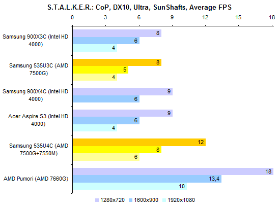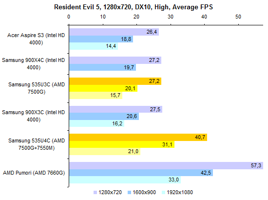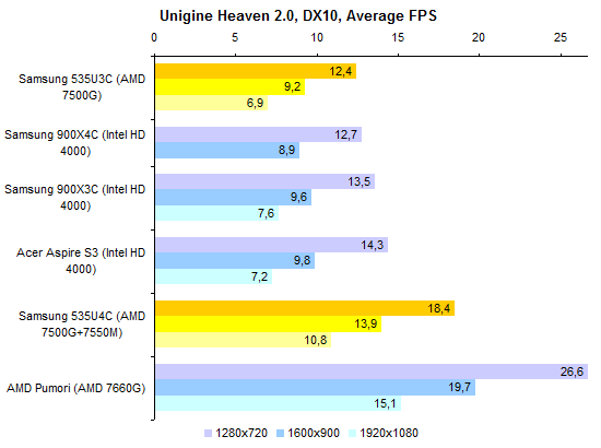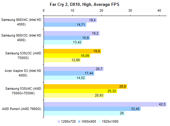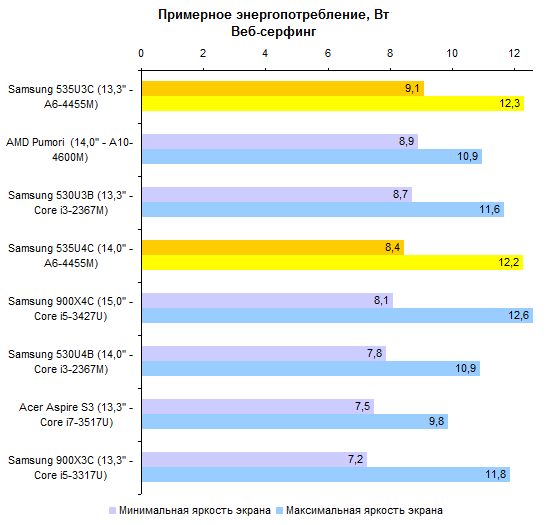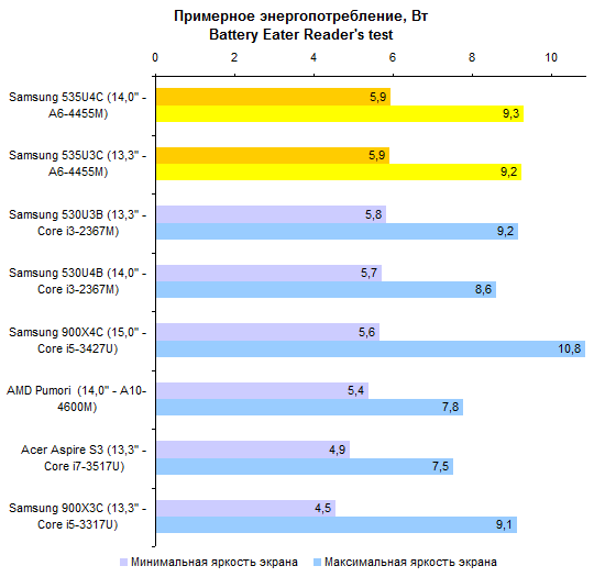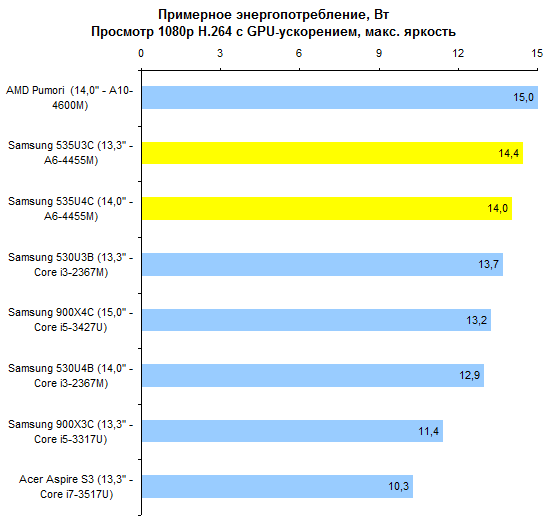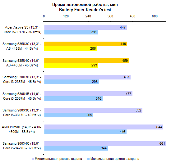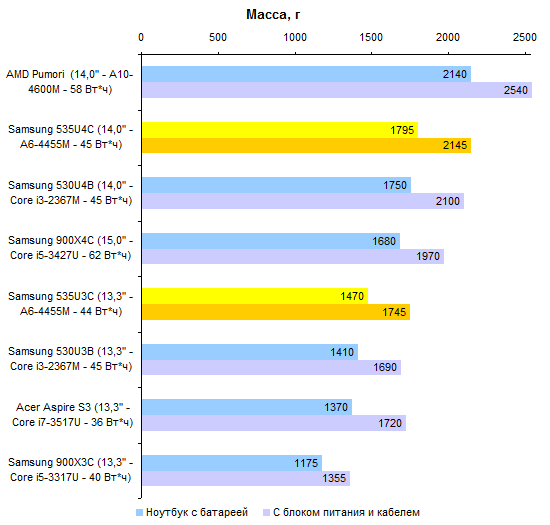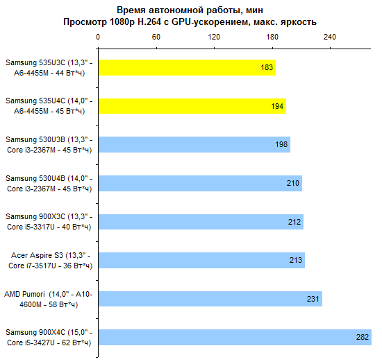 Процессоры AMD Bulldozer и в полноразмерном варианте не блещут производительностью — в урезанной низковольтной версии вычислительная мощность, само собой, еще ниже. Даже прошлогодние Core i3 ULV оказываются несколько быстрее, не говоря уже о более дорогих моделях нынешнего поколения, основанных на архитектуре Ivy Bridge. ![]() ![]() Что касается графики, то и здесь AMD нечем порадовать покупателей: по производительности Radeon 7500G примерно соответствует Intel HD 4000 в исполнении для ультрабуков. ![]() ![]() ![]() ![]() ![]() Судя по всему, проблема ультратонких ноутбуков на AMD и Intel одинакова — маломощные системы охлаждения не справляются с отводом тепла от чипа и графическое ядро перманентно пребывает в состоянии троттлинга. Формально это не троттлинг, а работа на некоей гарантированной частоте с редкими рывками в турборежим. Но суть от этого не меняется — при тесных и плохо охлаждающихся корпусах ультратонких ноутбуков рассчитывать на высокую скорость в играх по-прежнему не стоит. В общем, революция пока откладывается — в этом году ожидать появления сверхкомпактных мобильных компьютеров с приличными игровыми возможностями не стоит. ⇡#Тестирование — масса, время автономной работыНоутбуки оснащаются аккумуляторами, построенными на плоских элементах питания. Батареи похожи по характеристикам — обе обладают емкостью в районе 45 Вт*ч, но различаются по форме и конфигурации. В Samsung 535U3C используется плоский и большой по площади аккумулятор. Аккумулятор Samsung 535U3C В более крупном 535U4C батарея обладает скромными горизонтальными размерами, но зато оказывается весьма упитанной — в тонкую «тринашку» такая просто не поместилась бы. Аккумулятор Samsung 535U4C Блоки питания также не одинаковы: оснащенная внешней графикой 14-дюймовая модель нуждается в адаптере большей мощности — 60 Вт. А «тринашке» вполне хватает компактного 40-ваттного блока питания, который весит почти на сотню грамм меньше. В целом ультратонкие ноутбуки на платформе AMD получились чуть более тяжелыми, чем их аналоги на платформе Intel. Разница, конечно, пустяковая — порядка 50 грамм. Устроены ноутбуки совершенно идентично, вплоть до расположения основных элементов на платах — видимо, увеличение массы связано с чуть большим количеством декоративного металла на корпусе. ![]() Что касается времени автономной работы, то протестированные нами инженерные семплы ультрабуков Samsung Series 5 и розничные экземпляры ультратонких ноутбуков на платформе AMD той же серии показали сходные результаты. ![]() Разница достаточно стабильна для всех используемых нами режимов тестирования — практически при любых условиях она составляет порядка 20 минут. ![]() Правда, если для режима минимального энергопотребления 20 минут — это всего лишь 5%, то в более реалистичных сценариях отставание уже ближе к 10%, то есть не так уж и мало. ![]() Энергопотребление в основном немного выше. Исключение составляет сценарий с просмотром видео — здесь отставание от платформ Intel сильно более ощутимо. Встроенное графическое ядро AMD оказывается куда прожорливее при декодировании Full HD. Собственно, ту же картину мы наблюдали и в случае демоноутбука AMD Pumori — с той лишь разницей, что урезанное ядро Radeon 7500G оказывается заметно (следует дополнительно сделать поправку на HDD вместо SSD и яркий дисплей в ультратонких ноутбуках Samsung) экономичнее, чем наиболее продвинутый вариан