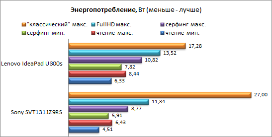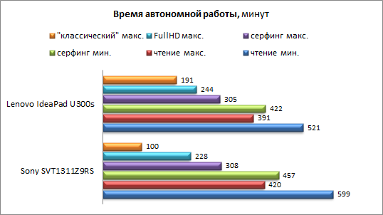 Результаты чуть-чуть выше, чем при тестировании VAIO T11, что, очевидно, можно связать с немного более просторным, лучше охлаждающимся корпусом. В целом производительность — это то, чего вполне достаточно у обоих ультрабуков Sony. Правда, это справедливо лишь для старших конфигураций с процессорами Core i7 — в младших по-прежнему используются процессоры Core i3 прошлого поколения, на ядре Sandy Bridge. Из-за отсутствия поддержки Turbo Boost они серьезно уступают всем остальным ULV-процессорам Intel. ⇡#Тестирование: время автономной работыВ VAIO T11 и T13 использованы одинаковые аккумуляторы на плоских элементах питания. Емкость их составляет 45 Вт*ч. ![]() ![]() Из-за более крупного дисплея старшая модель получилась чуть более прожорливой — время работы в среднем на 10% ниже. Это все еще неплохо, но уже не так впечатляет. ⇡#ВыводПо сравнению с 11-дюймовой моделью ноутбук получился несколько более комфортным в работе — просторная клавиатура, более крупный дисплей и чуть меньший уровень шума системы охлаждения. Во всех остальных отношениях VAIO T13 ничем не лучше VAIO T11, только больше и тяжелее. Из существенных недостатков следует отметить дисплей, который оказался ещё менее качественным, чем у 11,6-дюймовой модификации ультрабуков серии T, — небольшой цветовой охват, невысокая контрастность, далеко не лучшая цветопередача. Кроме того, 13-дюймовый ультрабук Sony работает от аккумулятора несколько меньше, чем 11-дюймовый. При этом стоит VAIO T13 на одну-две тысячи рублей дороже, чем VAIO T11. Кроме того, есть нюанс с насыщенностью рынка: VAIO T11 предстоит соперничать лишь с двумя моделями — MacBook Air 11 и ASUS UX21A, причем обе существенно дороже. А альтернатив VAIO T13 не просто много, а невероятно много — от копеечного Samsung 535U3C и недорогого Acer Aspire S3 до ASUS UX31A, Samsung 900X3C и обновленного MacBook Air 13, с многочисленными остановками на любой вкус и кошелек. Первой группе «тринашка» Sony проигрывает по цене, второй — по качеству дисплея, массе и габаритам. Редакция 3DNews благодарит компанию «Графитек» за предоставленный в распоряжение нашей лаборатории измерительный комплекс Spyder4Elite и украинское представительство Sony за предоставленный ультрабук VAIO T13.